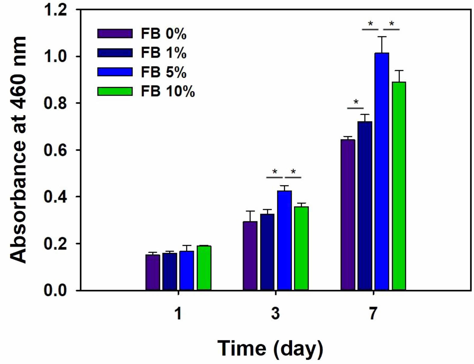 Proliferation of MC3T3-E1 cells on gelatin-chitosan membrane containing fish bone (FB) for 7 days (*p<0.01).