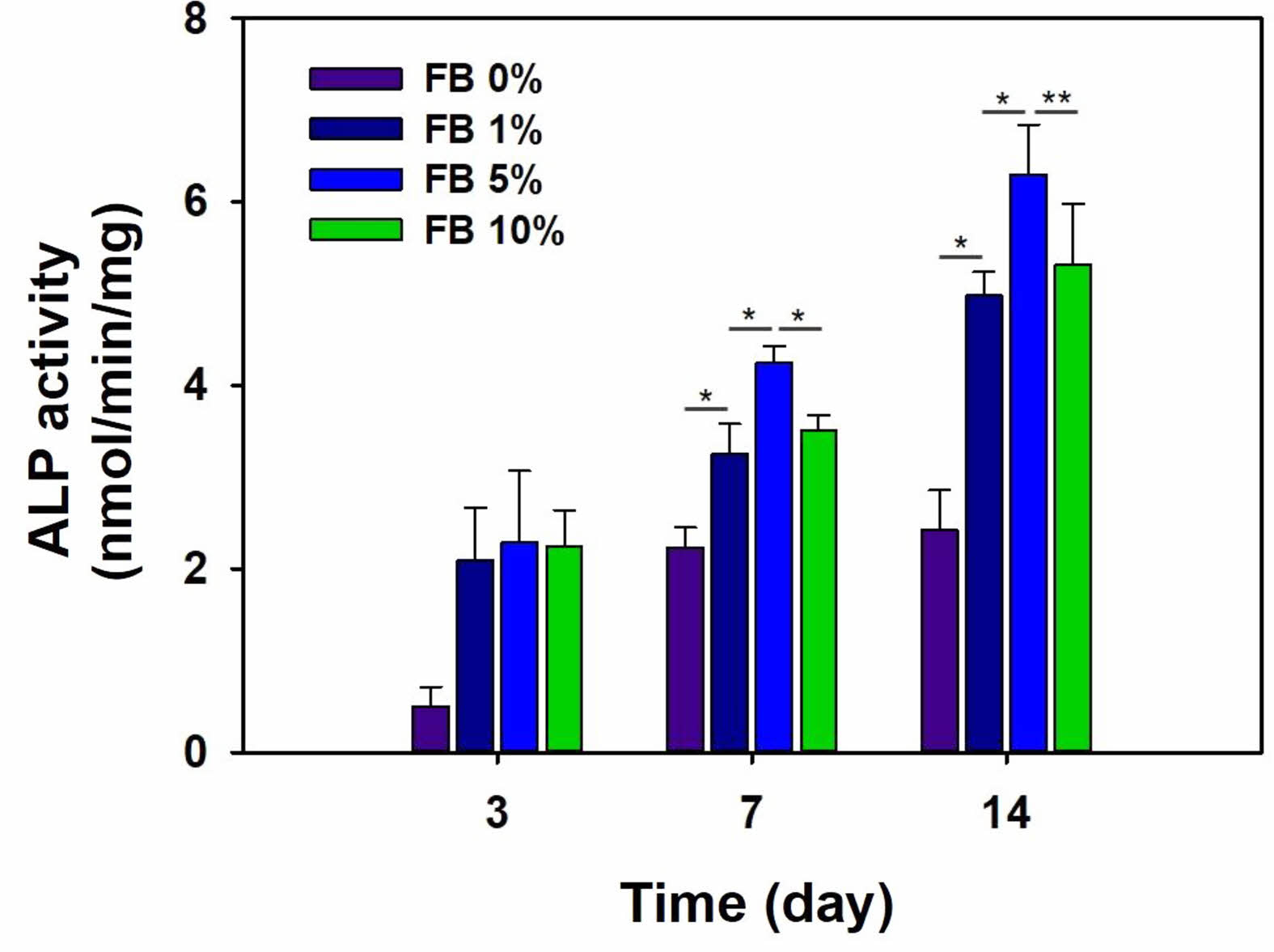 ALP activity assay of MC3T3-E1 cells on gelatin-chitosan membrane containing fish bone (FB) for 14 days (*p<0.01, **p<0.05).