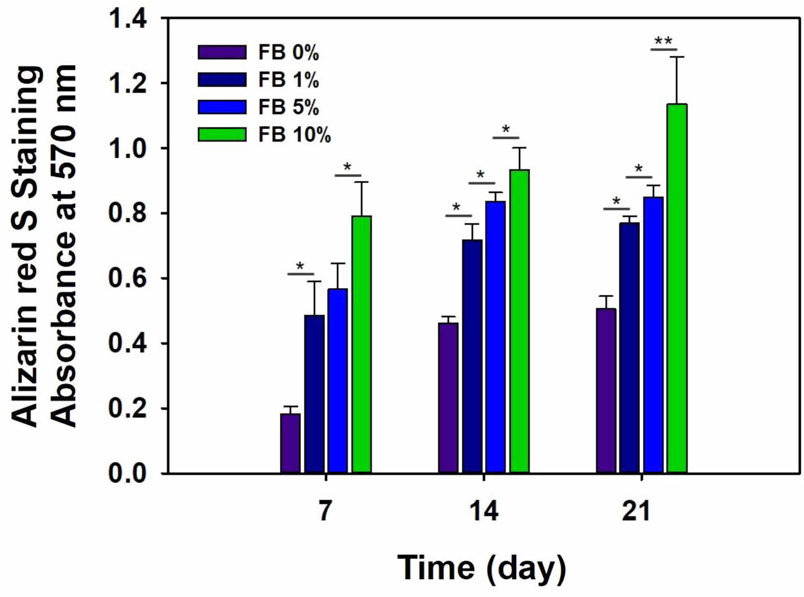 Alizarin red S staining of MC3T3-E1 cells on gelatin-chitosan membrane containing fish bone (FB) for 21 days (*p<0.01, **p<0.05).