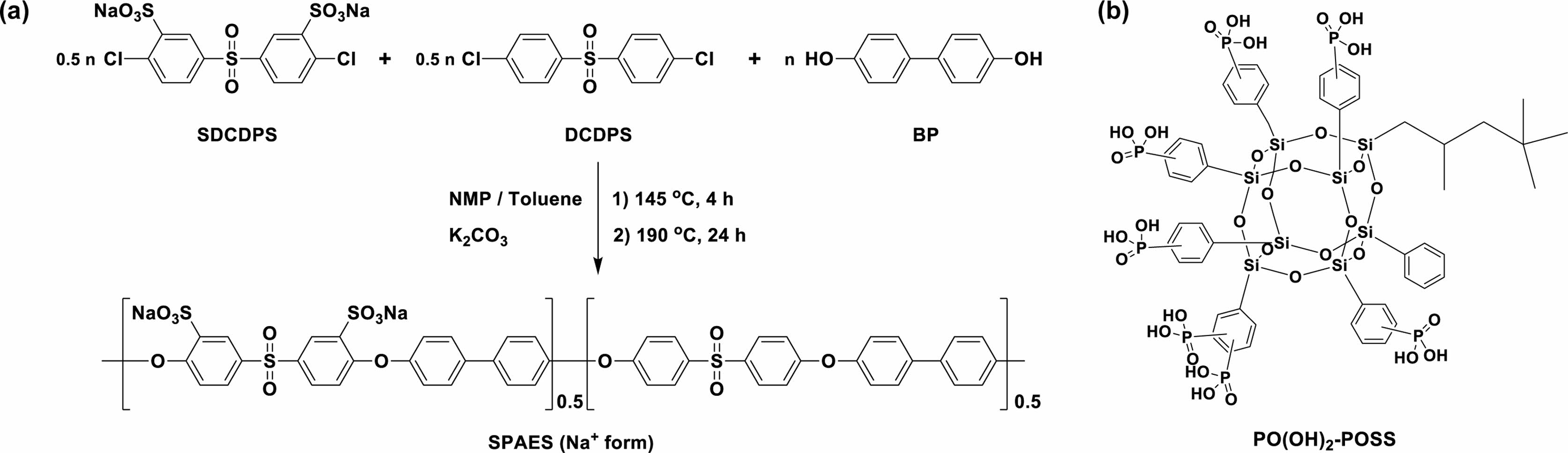 (a) Synthesis of SPAES (Na+ form); (b) phosphonic acids-functionalized POSS.
