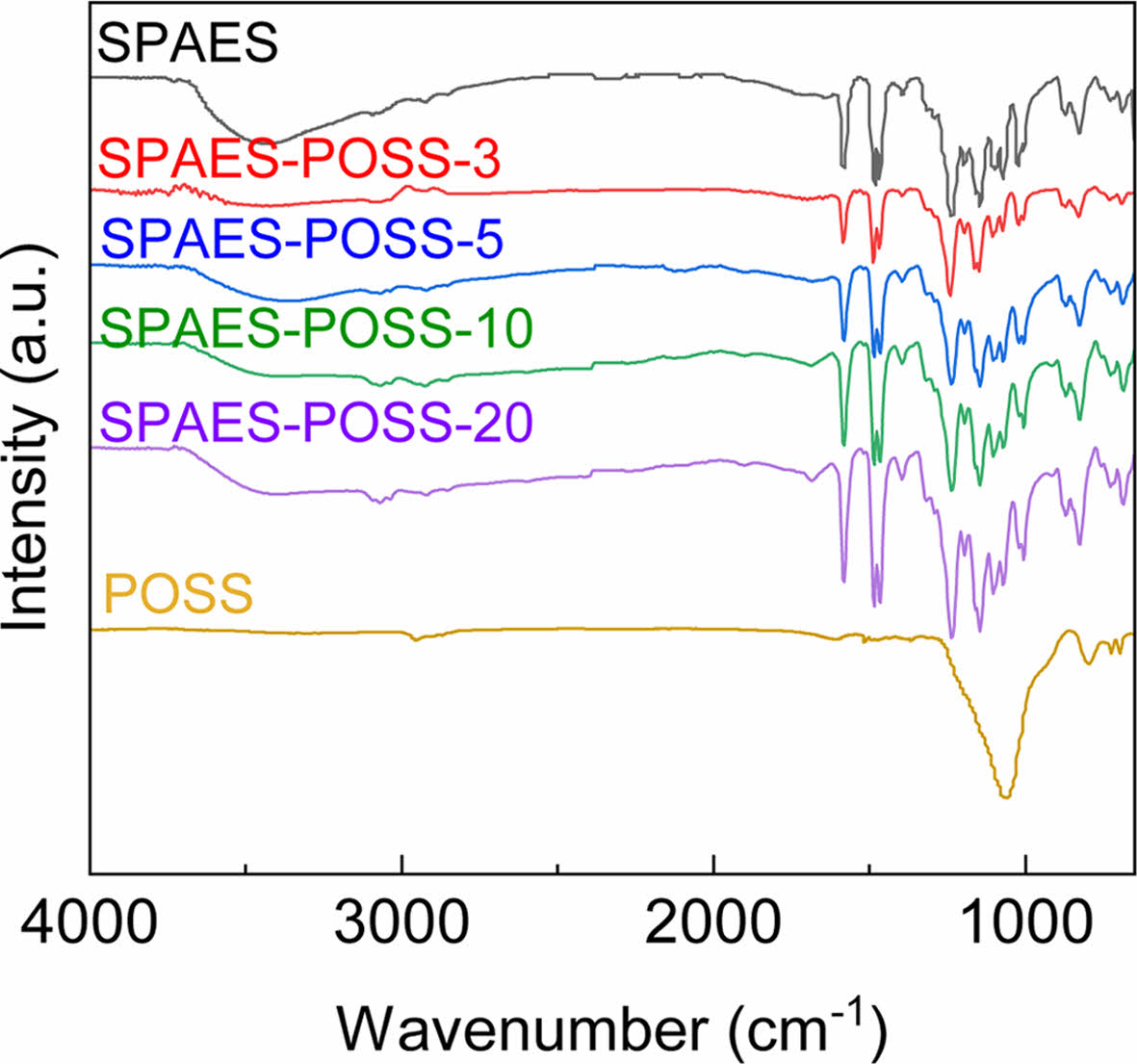 제조된 복합체 전해질막은 ATR 모드 적외선 분광기를 통해 화학 구조를 분석하였다(Figure 3). 1580 및 1490 cm-1의 피크는 SPAES 내에 페닐 설폰 부분의 C=C 고리 스트레칭 흡수에 이에 의한 것이다. 각 스펙트럼의 지문 영역에서 1240 cm-1에서 강한 밴드가 발견되었으며 이는 에테르 결합의 C-O 스트레칭을 나타낸다. SPAES에서 설폰산 그룹의 진동은 1030(대칭 신장) 및 1082 cm-1(비대칭 신장) 및 1110 cm-1(비대칭 신장)에 의한 것이다. 또한 1101과 1143 cm-1에서 유사한 진동을 발견했다. POSS의 특징적인 피크로는 인산 결합(P=O) 스트레칭이 약 1680 cm-1에서 관찰되었다. 무엇보다도 1300-868 cm-1의 넓은 범위에서 POSS의 강한 밴드가 발견되는데, SPAES 내에 POSS의 함량이 증가함에 따라 이와 관련된 피크의 세기가 증가하는 것을 통해 SPAES 내 POSS 복합화가 성공적으로 잘 이루어진 것을 확인할 수 있었다.