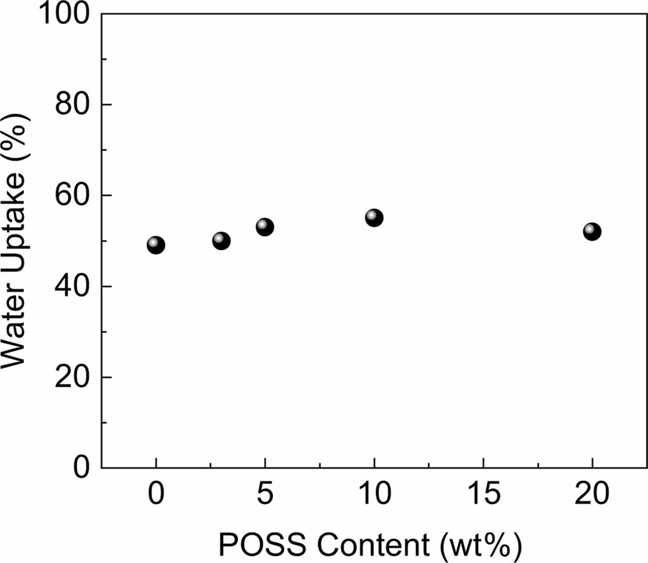 Water uptakes (%) of SPAES-POSS composite membranes as a function of POSS contents.