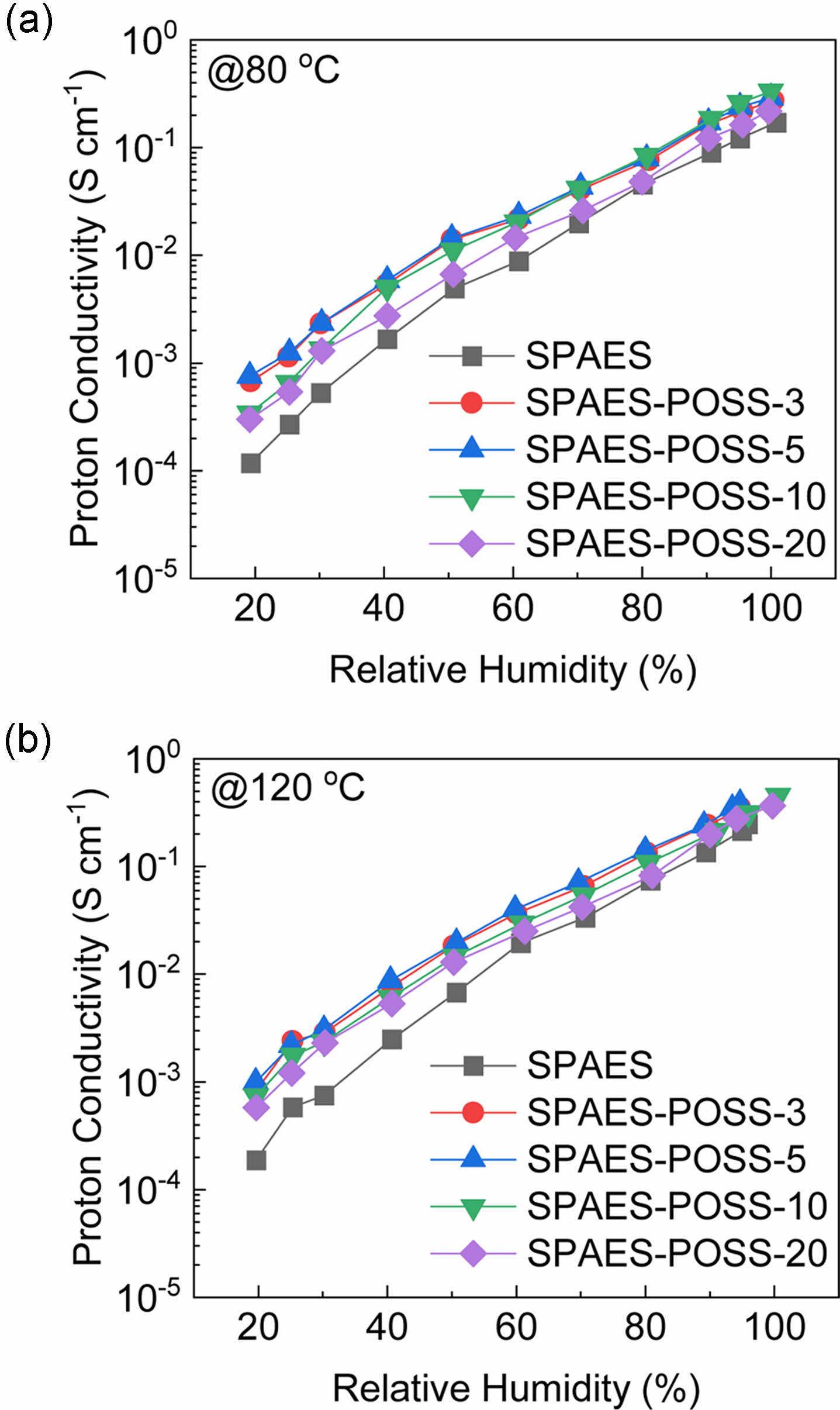 Proton conductivities of SPAES and SPAES-POSS composite membranes at (a) 80 ℃; (b) 120 ℃ as a function of relative humidity.