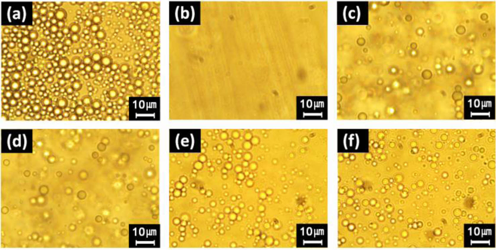 Figure 1 Optical microphotographs of (a) O/W emulsion with 10 wt% n-octadecane only; (b) blend solution of 1 wt% PVA and 3 wt% SA; (c)-(f) hybrid solutions of : PVA (wt%)+SA (wt%)=(c) 1+3; (d) 3+3; (e) 12+4; (f) 18+0. Solid content of n-octadecane was maintained constant at 20 wt% (SA: sodium alginate). |