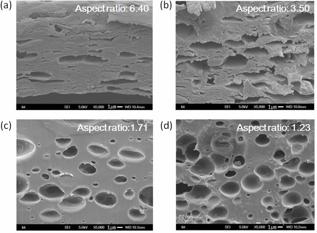 Figure 2 Cross-sectional SEM images of in situ shape-stabilized composite films according to the different contents and ratio of polymers in the hybrid solutions: PVA(wt%)+SA(wt%)=(a) 1+3; (b) 3+3; (c) 12+4; (d) 18+0. Solid content of n-octadecane was maintained constant at 20 wt% (SA: sodium alginate). |
