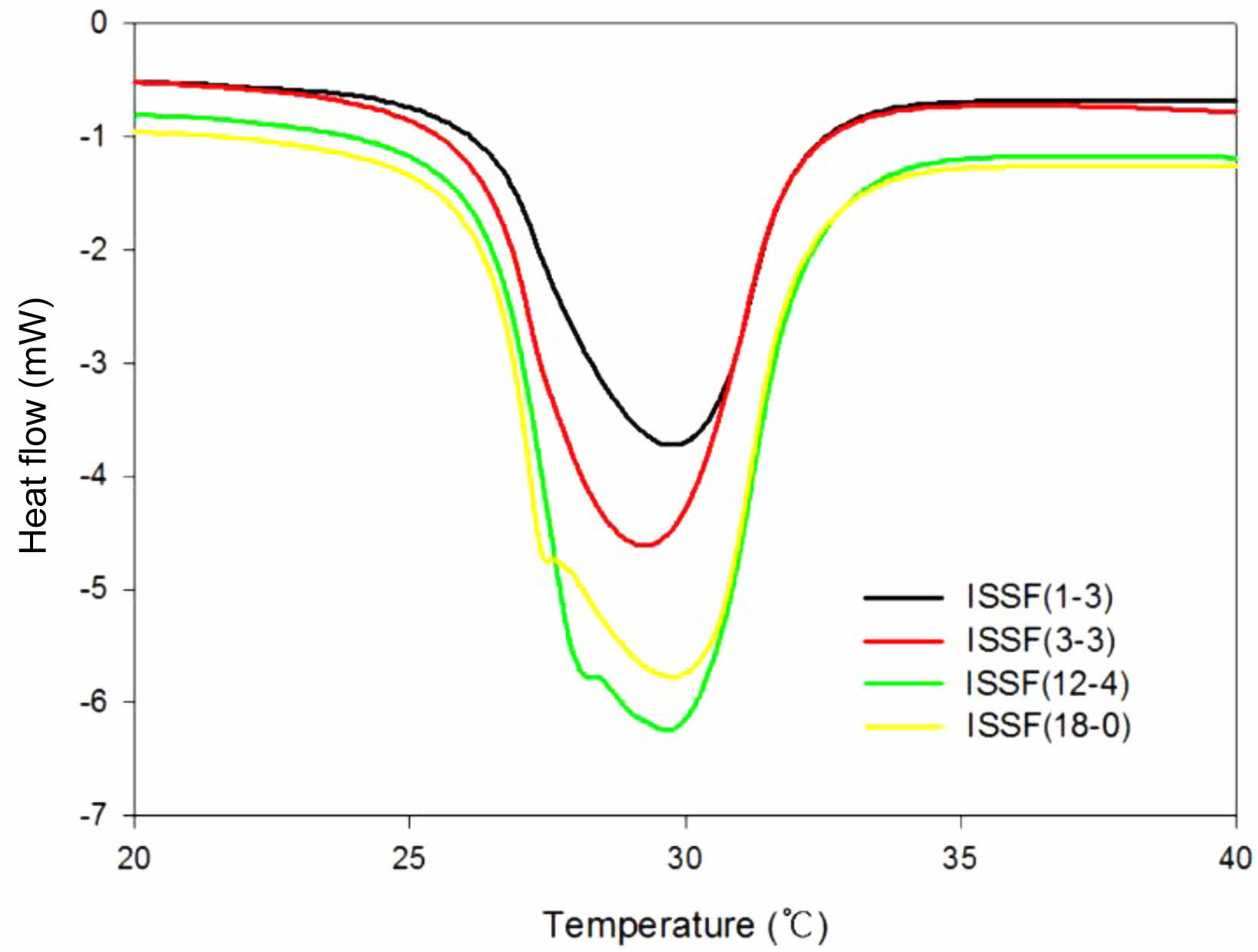 Figure 3 DSC endothermic behavior of ISSFs with 20 wt% of noctadecane according to the concentration of polymers in hybrid solutions. |