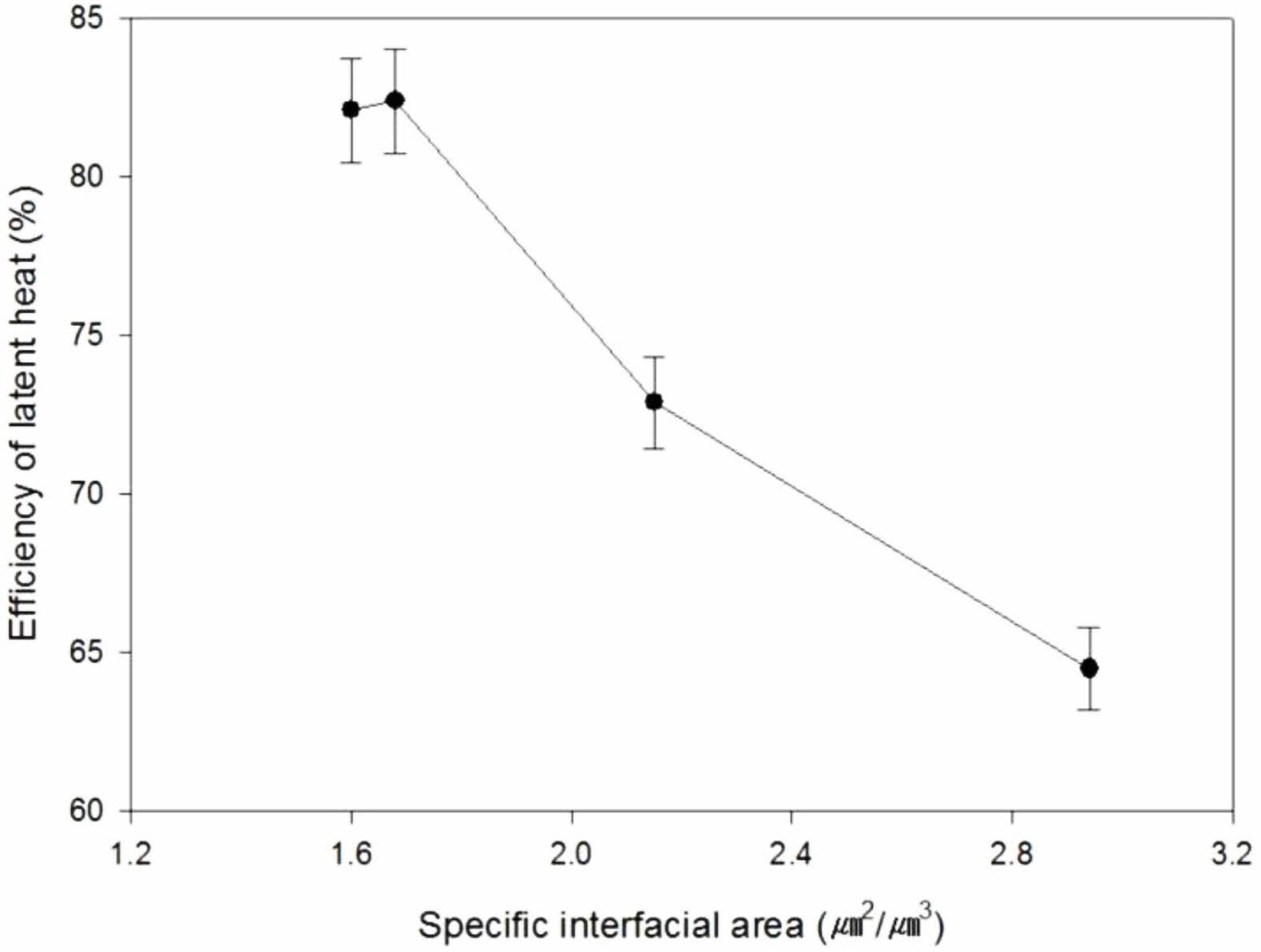 Figure 6 Effect of specific interfacial area of n-octadecane domain on efficiency of latent heat for ISSFs with 20 wt% of n-octadecane. |