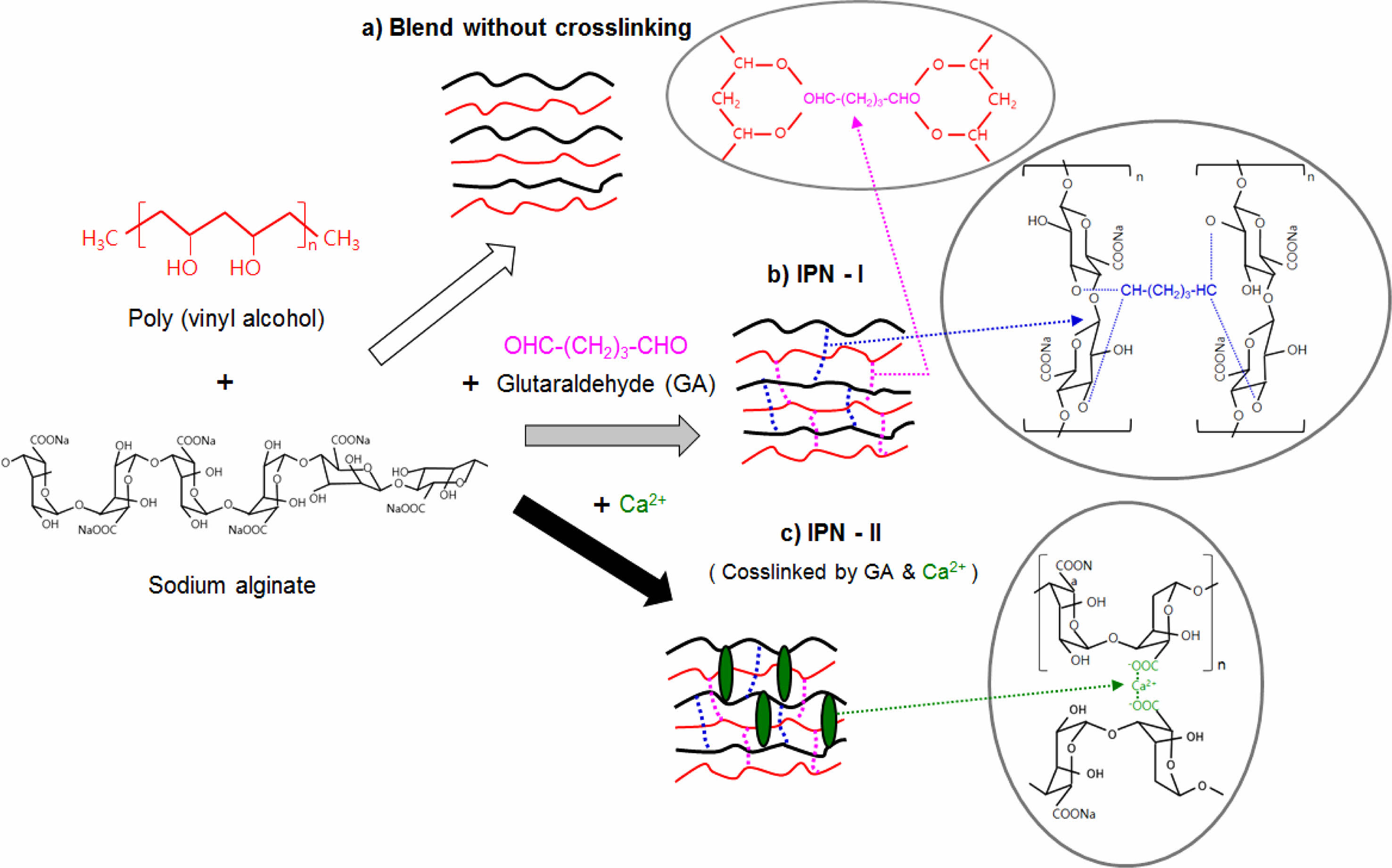 Figure 7 Schematic diagram showing formation of IPNs with glutaraldehyde and/or ionic crosslinking of the alginate/PVA blend with calcium ion. |
