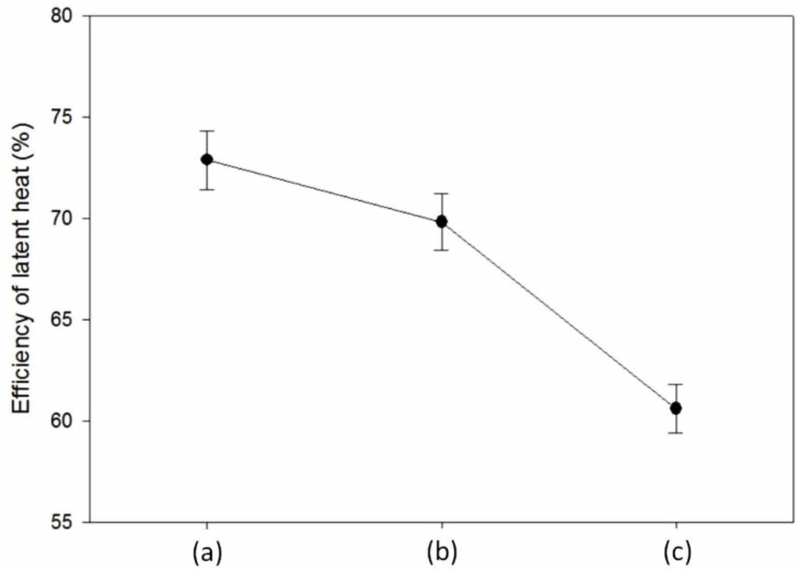 Figure 11 Efficiency of latent heat of ISSFs with 20 wt% of n-octadecane according to the modifications of matrix polymers: (a) blend without modification; (b) IPN-I; (c) IPN-II. |
