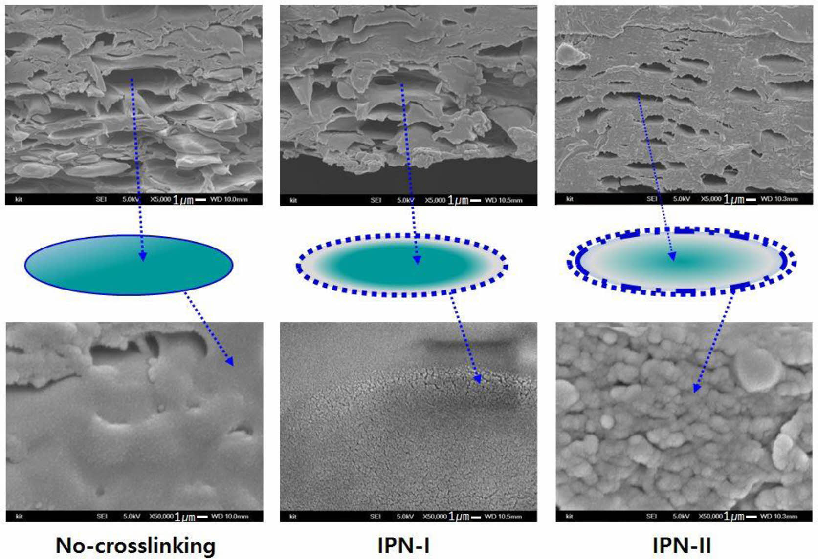 Figure 12 Cross-sectional SEM images (upper: ×5000; lower: ×50000) of ISSFs with 20 wt% of n-octadecane and schematic drawing showing interface roughness according to modifications of matrix polymers |
