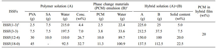 알긴산/PVA/옥타데칸 복합용액으로부터 동시 형태 고정화 필름 제조. 제조된 알긴산/PVA/옥타데칸 복합용액을 닥터나이프로 유리판 위에 캐스팅 후 경화하고 진공 건조하여 옥타데칸이 알긴산/PVA 매트릭스에 동시형태고정화된 복합필름을 제조하였다(이하, ISSFs로 표기함). 이렇게 제조한 ISSFs의 조성은 Table 1에 나타내었다.