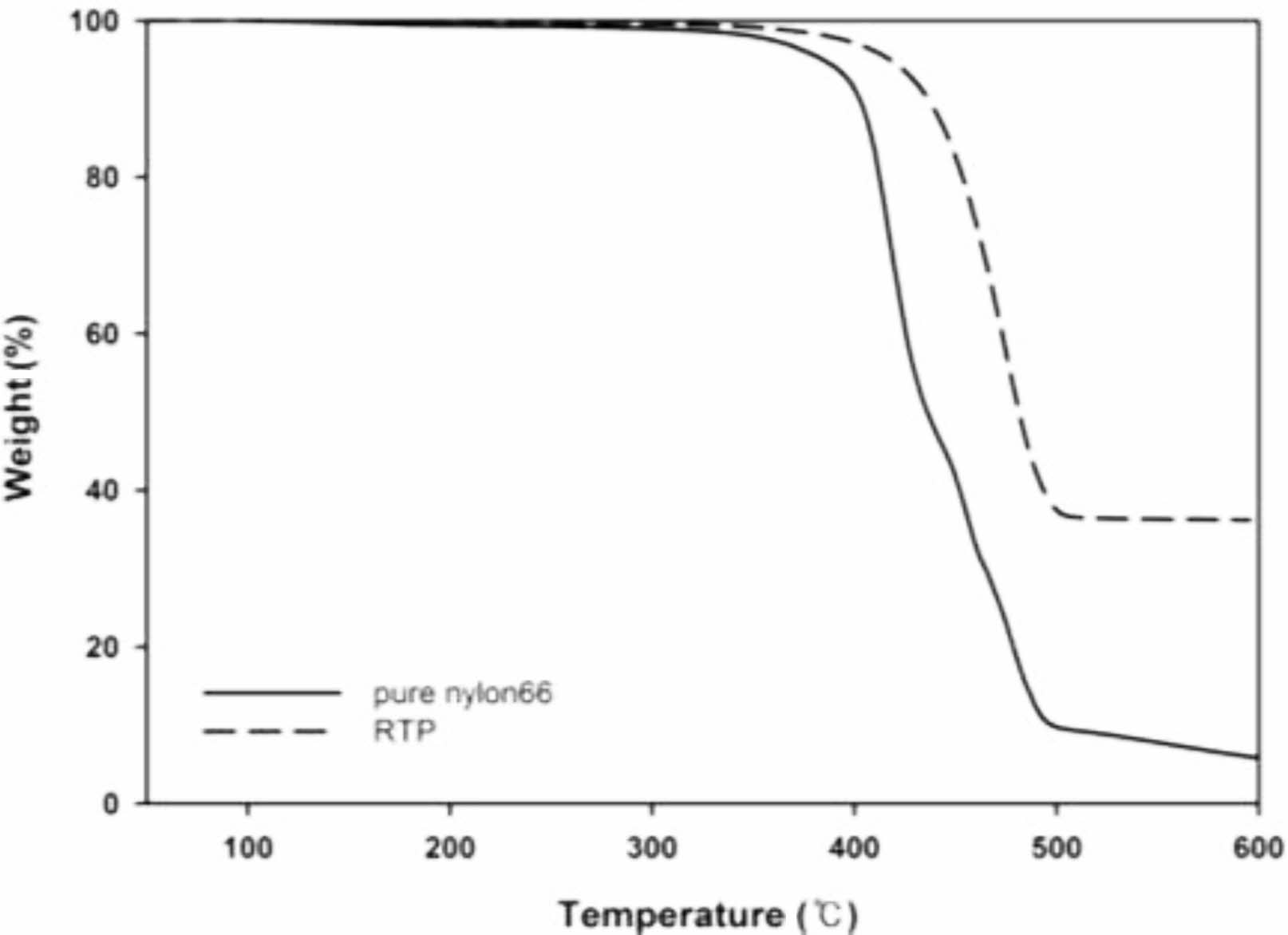 Figure 2 TGA thermograms of pure Nylon66 and RTP composite |