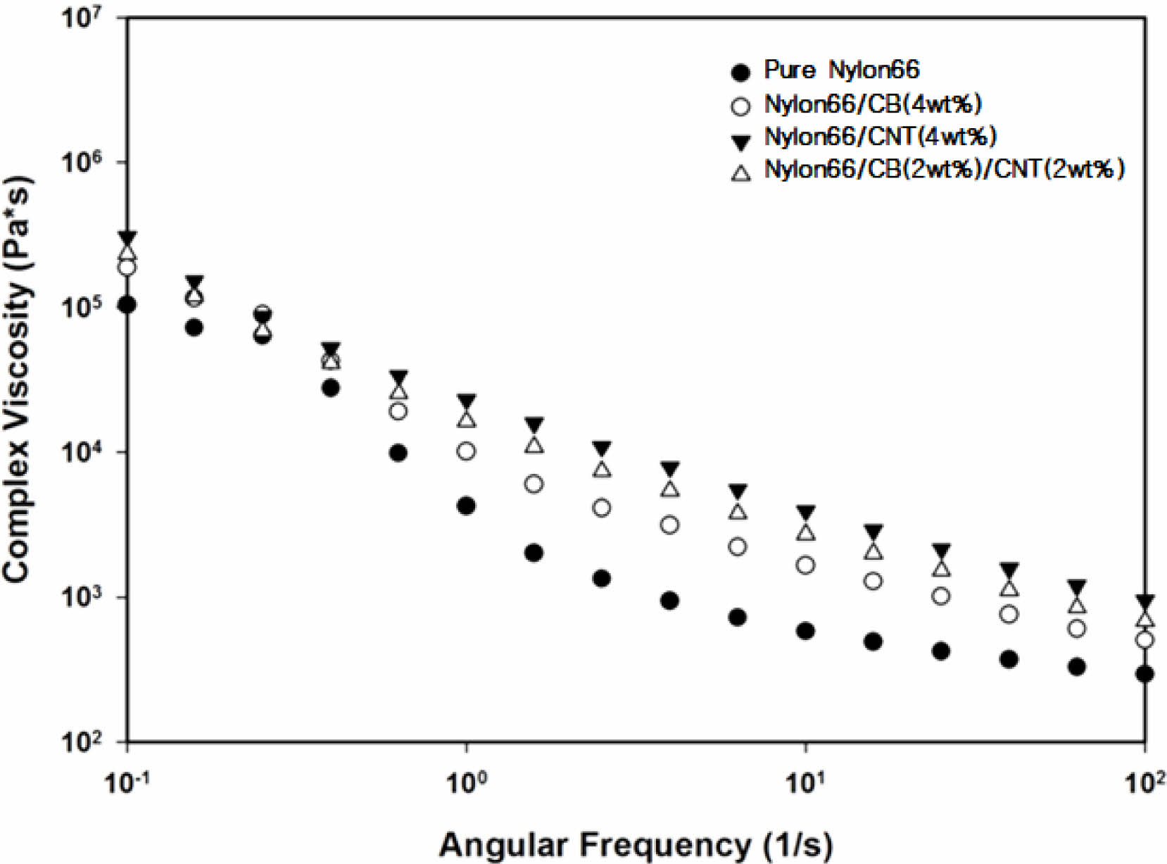 Figure 3은 나일론66과 나일론66/탄소 필러 복합체의 주파수(frequency)에 따른 복소 점도(complex viscosity, h*)를 나타낸 것이다. 복소 점도는 나일론66/탄소필러 복합체들이 나일론66 보다 상대적으로 높은 값을 보이는 것을 확인할 수 있다. 특히 CNT가 첨가될 경우 높은 복소 점도를 보이는데, 이는 CNT의 높은 종횡비에 의해 구형의 CB과 비교하였을 때, 높은 점도를 가지게 되기 때문으로 판단된다. 그러한 이유로 CB과 CNT를 혼합하여 제조된 복합체의 경우 CB과 CNT의 평균 값의 복소 점도 거동을 보인다.