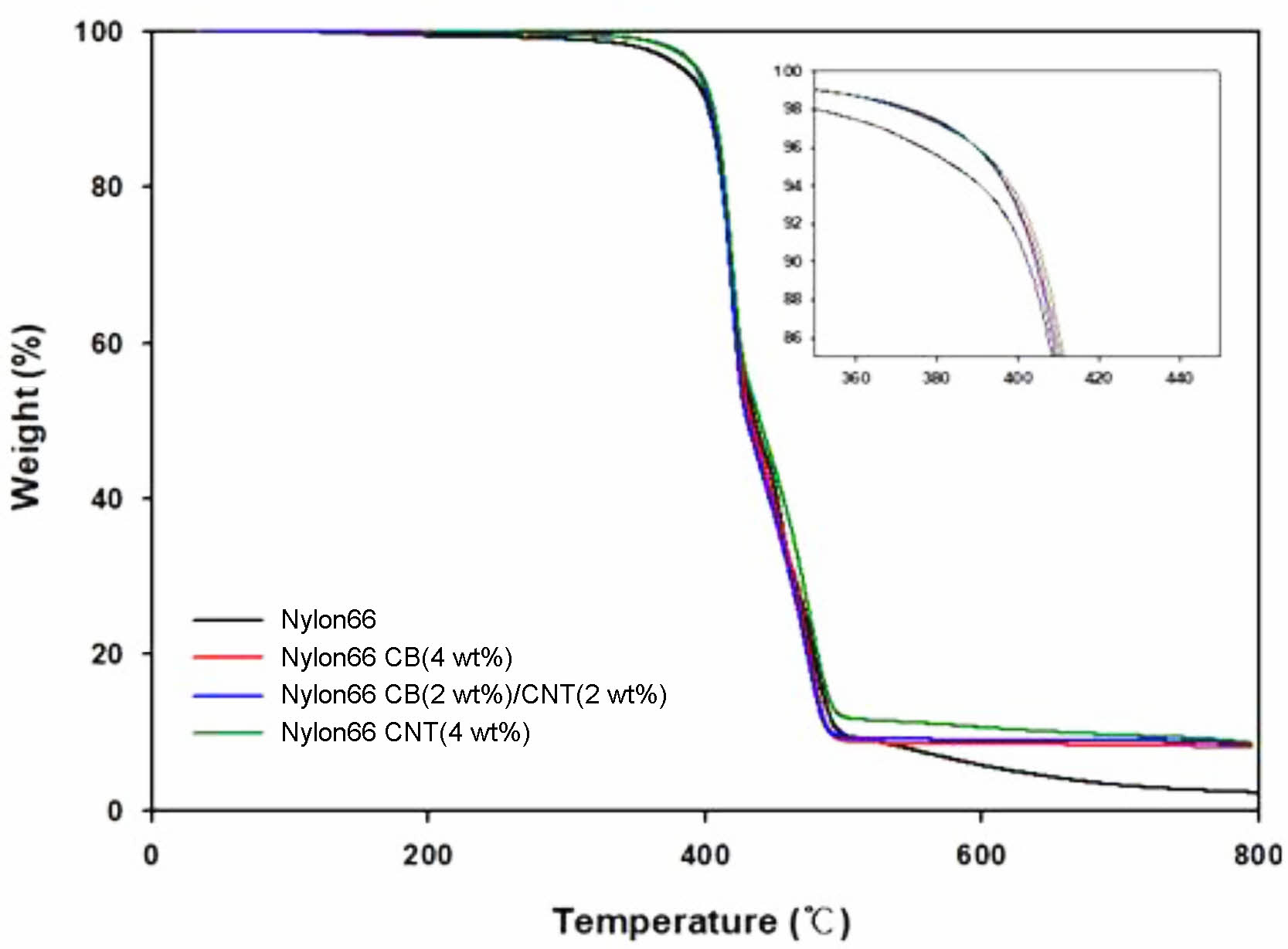 Figure 4는 나일론66/CB/CNT 복합체의 열분해거동을 고찰하기 위해 TGA를 측정하고, 그 결과 값을 나타낸 것이다. 분해 온도는 무게 감소율이 5%되었을 때를 측정한 값으로 순수 나일론66은 384 oC이고 복합체인 나일론66/CB, 나일론66/CNT/CB, 나일론66/CNT의 경우 분해 온도가 각각 393.9, 393.8, 394.8 oC였다. 이는 탄소계 필러를 첨가하여 고분자와 복합체를 만들 때 일반적으로 열 안정성이 증가하는 현상과 일치한다. 나일론66/CNT인 경우가 가장 높은 열분해 온도를 나타내지만, 나일론66/CNT/CB와 나일론66/ CNT의 열분해 온도에는 큰 차이가 없는 것으로 확인되었다.