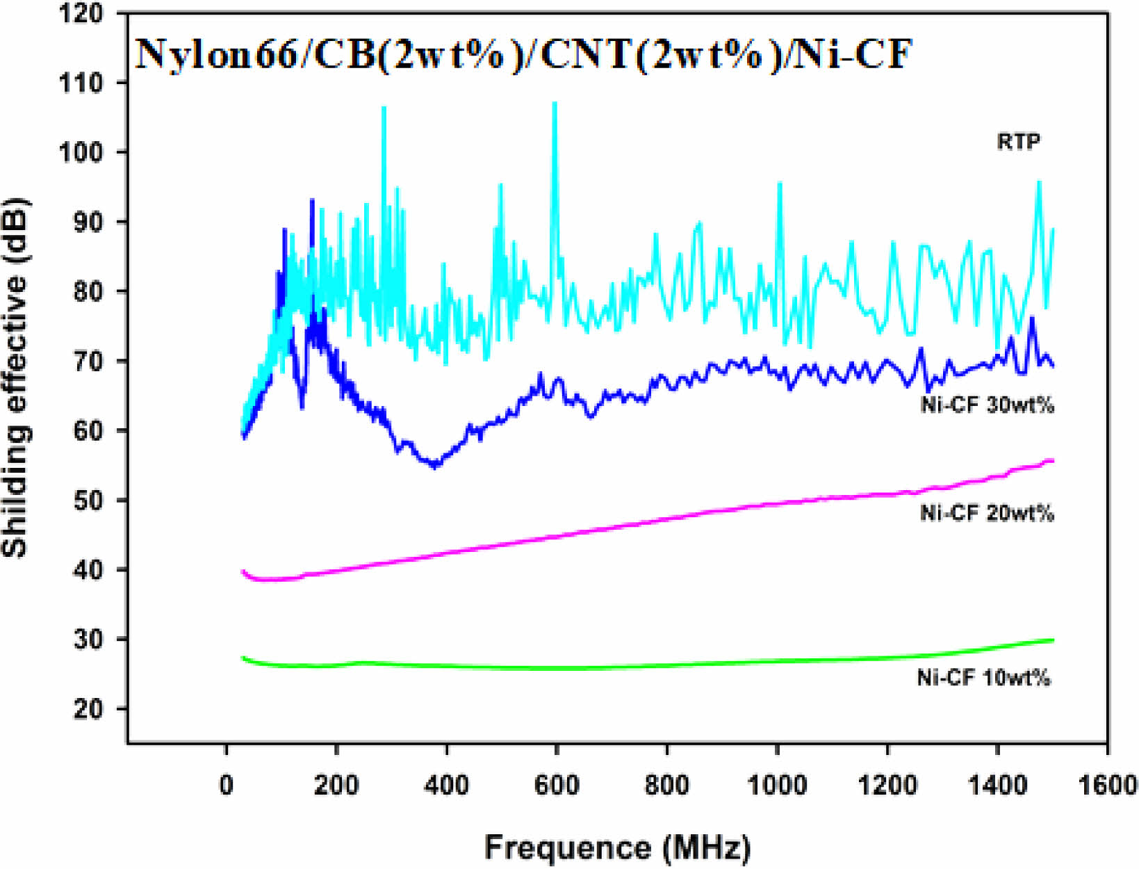 Figure 5 EMI shielding effectiveness of Nylon66/CNT/CB//Ni-CF composites and RTP. |
