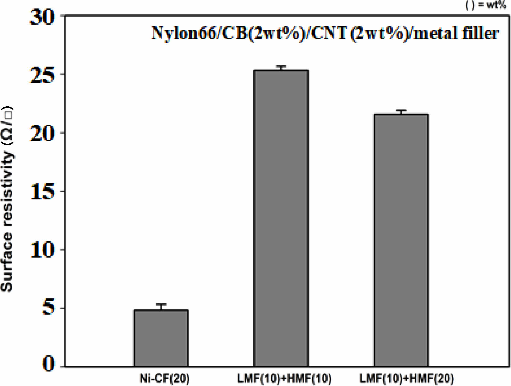 전자파 차폐를 위한 고분자 복합소재의 경우 탄소 필러와 함께 금속 필러의 적용도 진행되었고, 본 연구에서는 저융점(주석, LMF)과 고융점(구리, HMF)의 금속 필러를 혼합 사용하여 Ni-CF와 비교 검토하였다. Figure 6은 CB 2 wt%와 CNT 2 wt%가 혼합된 나일론66에 Ni-CF가 20 wt% 첨가된 경우와 금속 필러가 동일 함량 이상 처방된 복합체의 표면 저항을 나타낸 것이다.