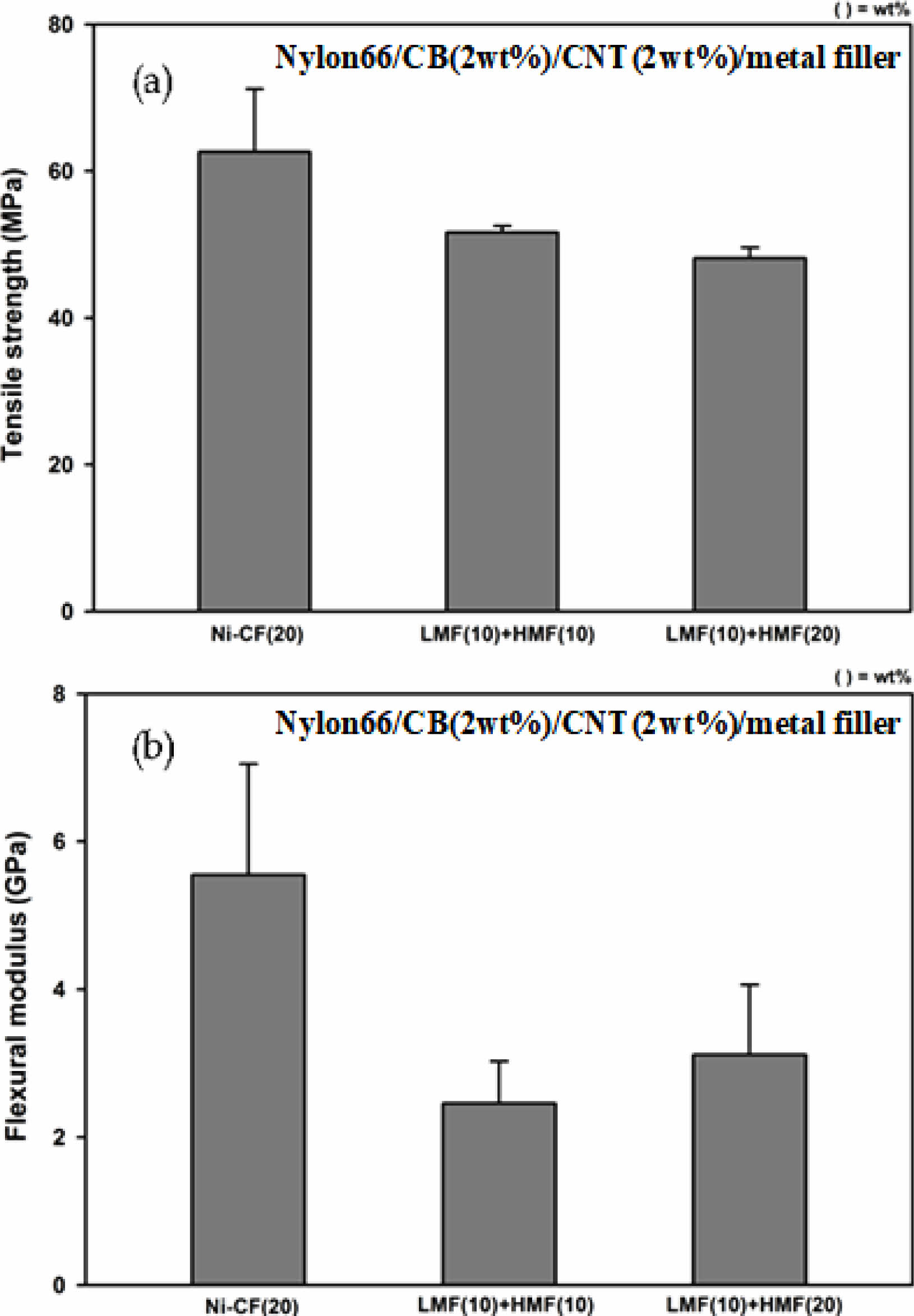 Figure 7 (a) Tensile strength; (b) flexural modulus of Nylon66/ CNT/CB//Ni-CF and metal filler composites. |