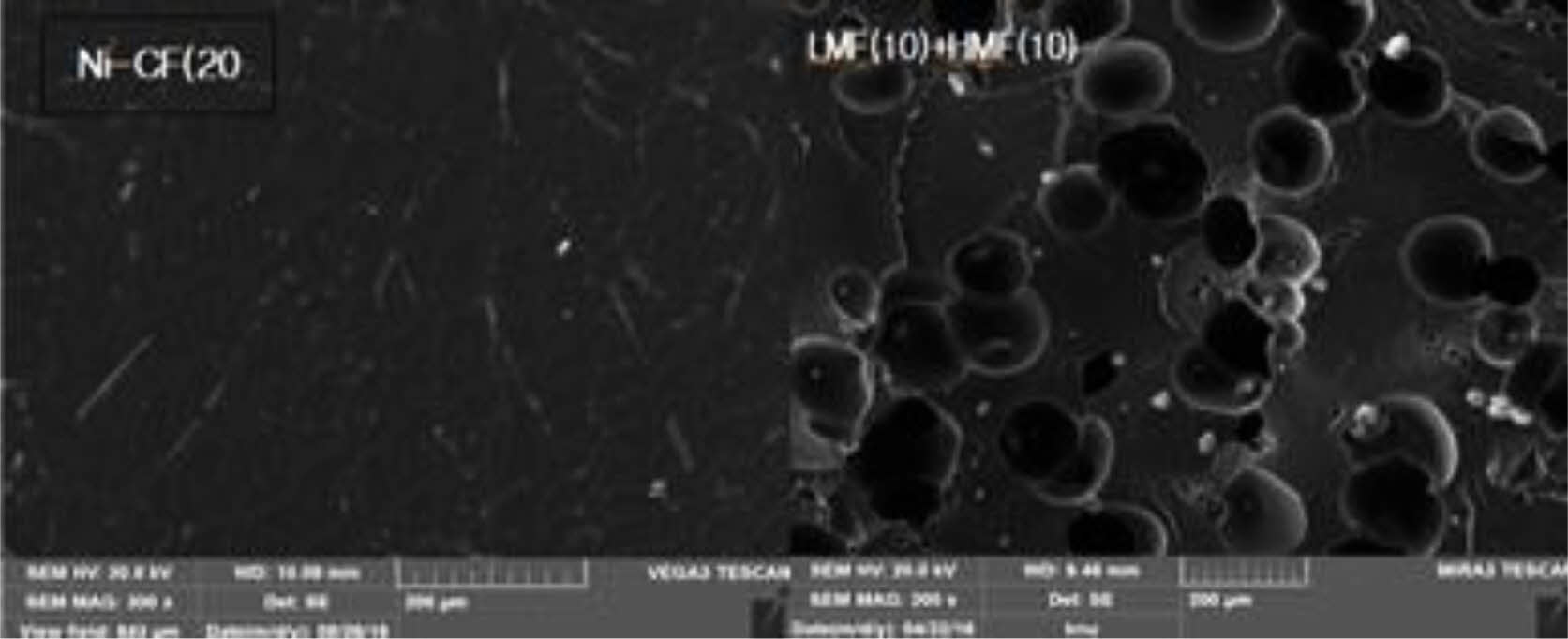 Figure 8은 Ni-CF와 금속 필러가 적용된 복합체의 인장시험 후 파단면의 SEM 사진을 나타낸 것이다. Ni-CF의 경우 섬유상의 구조가 보이는 반면 구형의 금속 필러가 적용된 경우 필러가 이탈된 원형 구조의 빈 공간이 나타남을 확인할 수 있고, 이와 같은 원형 형태의 분산은 전기적 네트워크 형성에 분리하기 때문에 전기적 특성이 열세하고 또한 기계적인 보강 효과도 저하되는 것으로 판단된다. 저 융점 또는 고 융점 금속 필러가 전기적 특성 향상을 위해 고분자에 혼합되는 연구가 시도되기는 하지만 본 연구에서는 Ni-CF의 효과가 더 우세한 것으로 확인되었다.