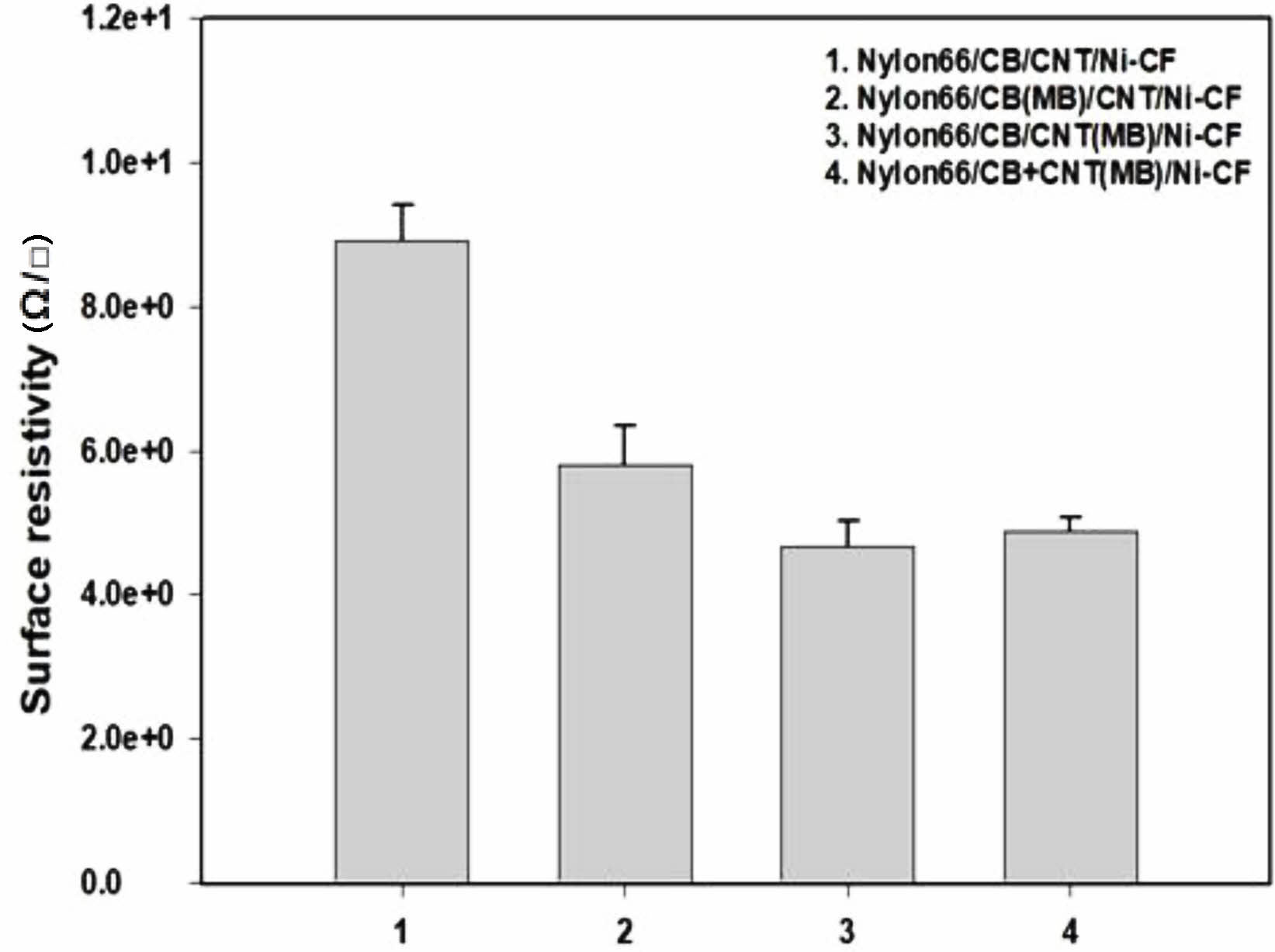 Figure 9 Surface resistivity of Nylon66/CNT/CB//Ni-CF composites according to CB or CNT master batch. |