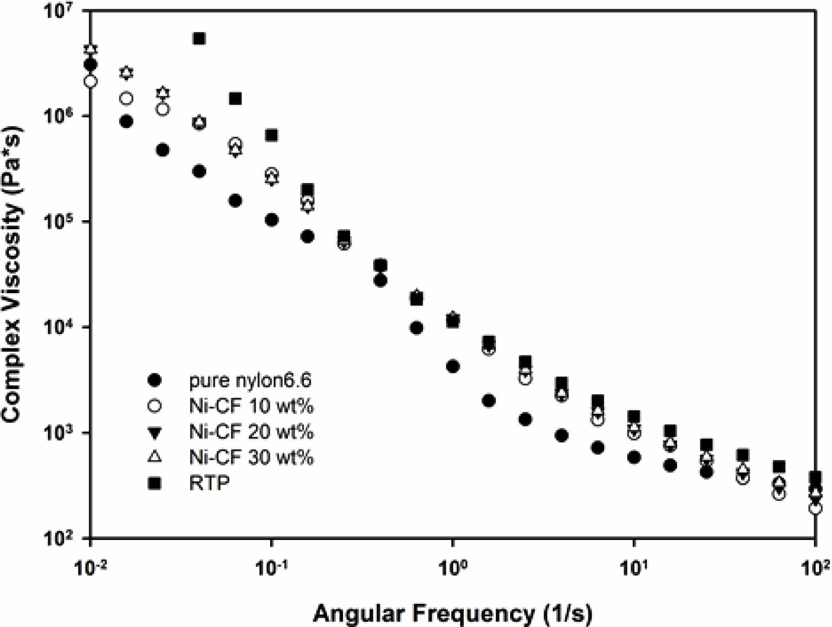 Figure 10 Complex viscosity of Nylon66/CNT(2)/CB(2)/ Ni-CF composites and RTP composite. |