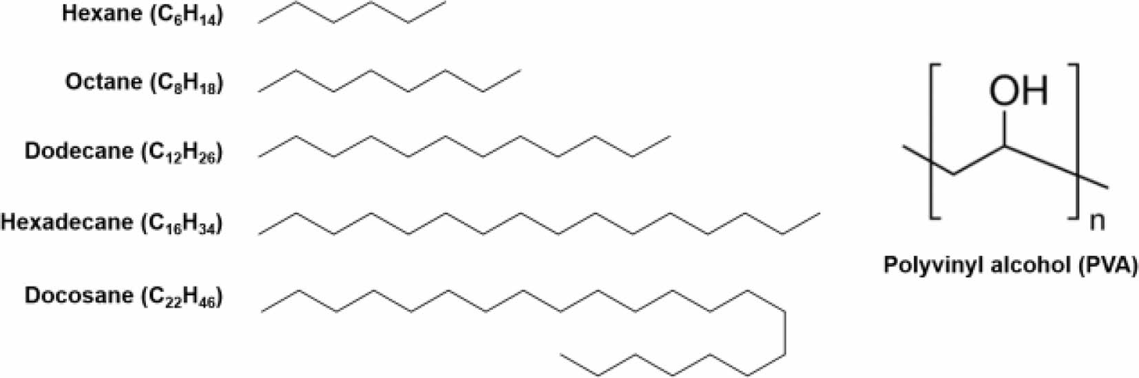 Figure 1 Chemical structures of straight-chain alkanes (dispersed phase) and PVA (stabilizer) used in the emulsion formulations. |