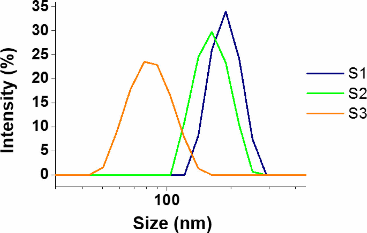 Figure 2 Hydrodynamic diameter distributions of the emulsion droplets dispersed in samples S1, S2, and S3. |