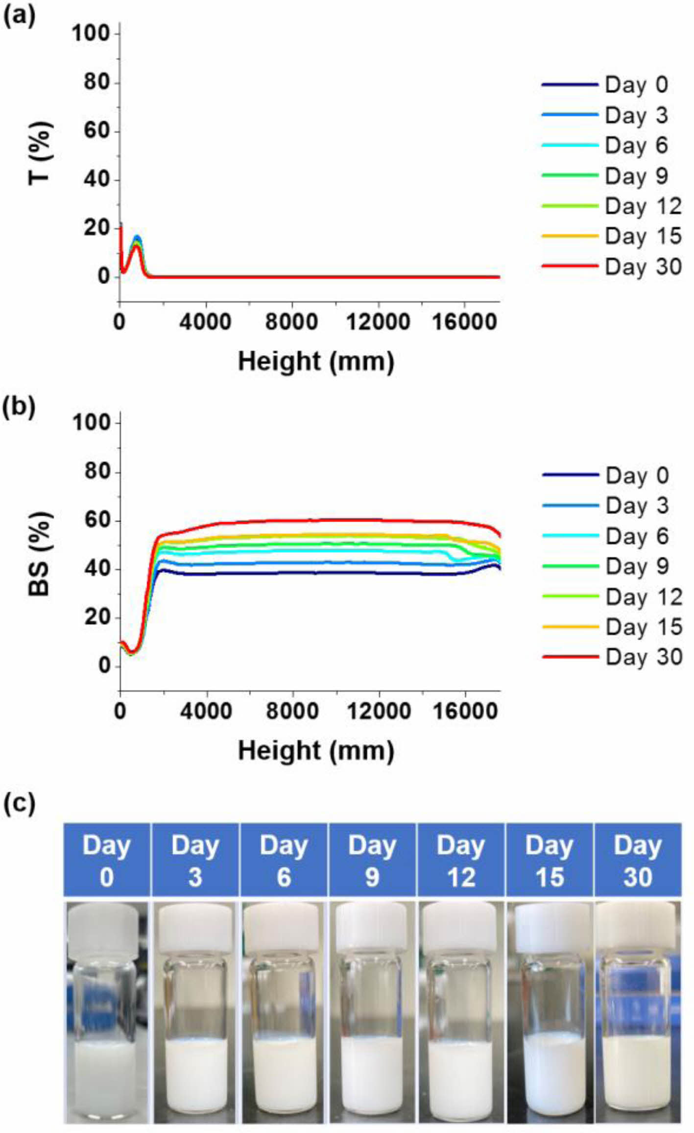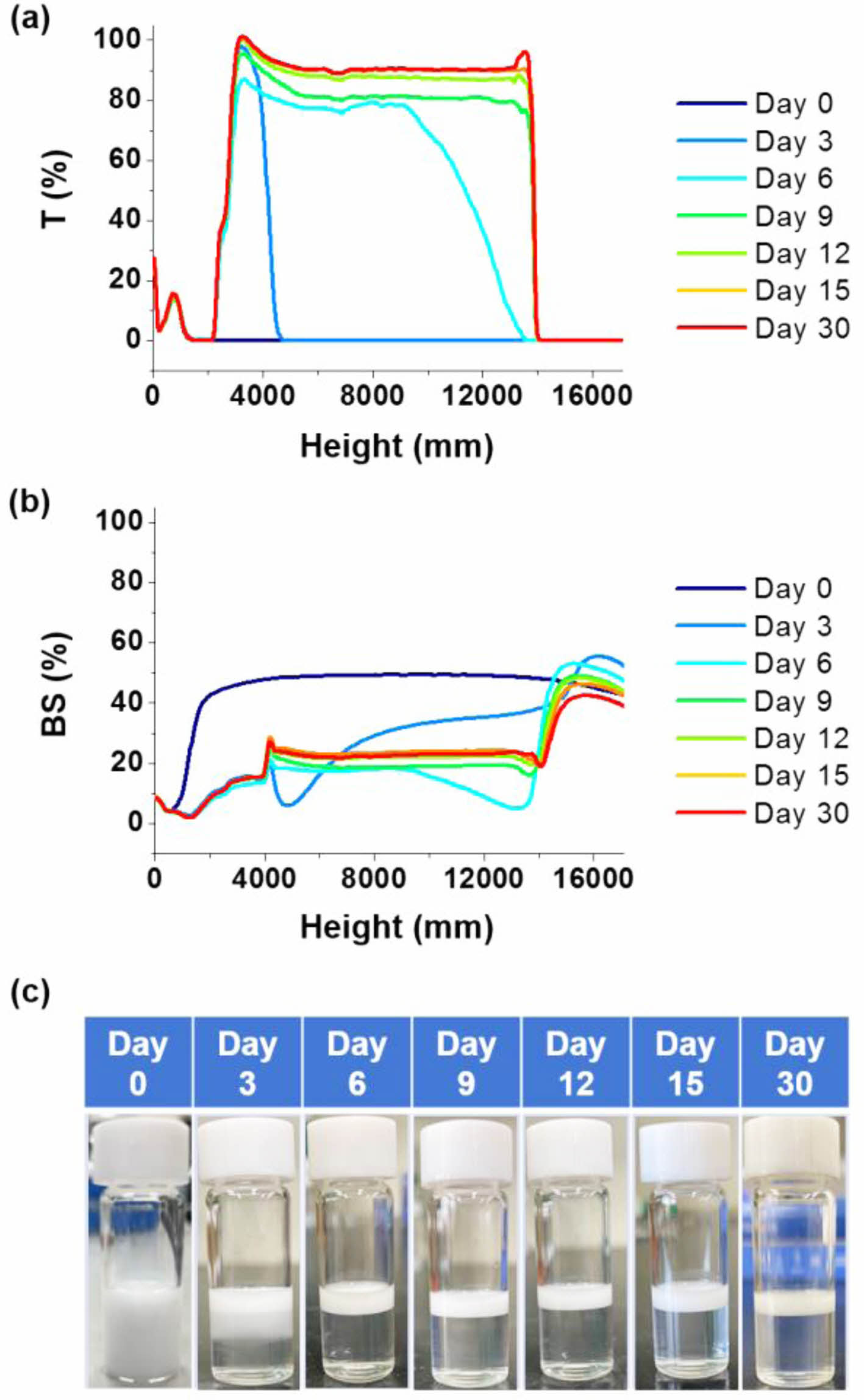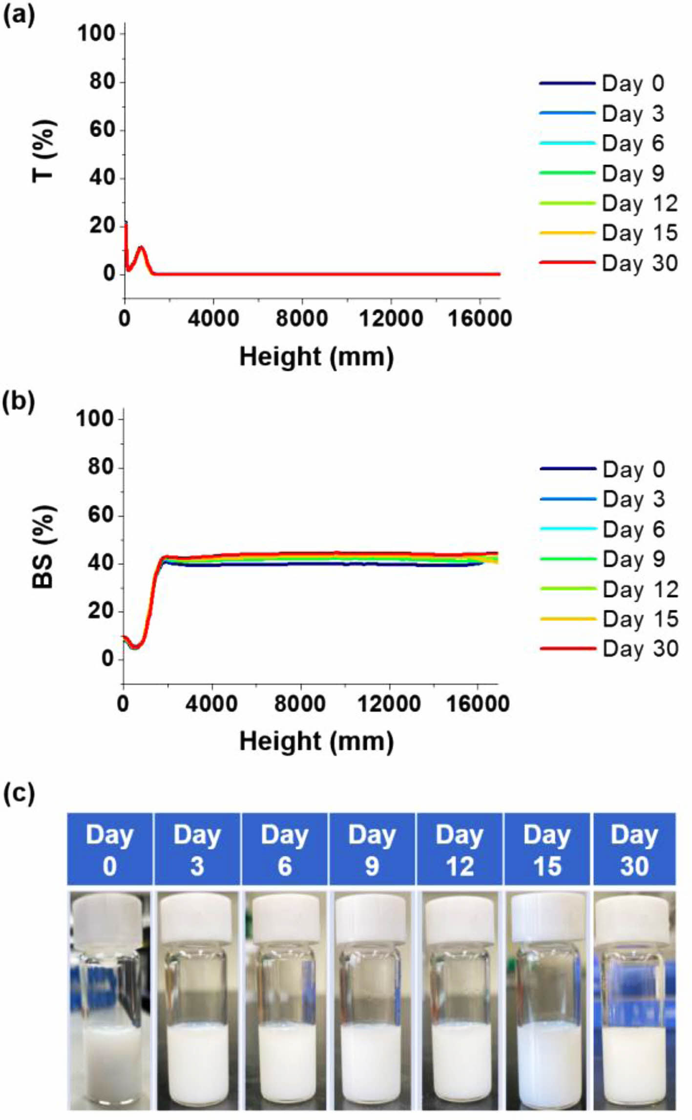 Figure 13 Stability of the emulsion S7: (a) NIR transmittance; (b) backscattering results; (c) visual observation for 30 days. |