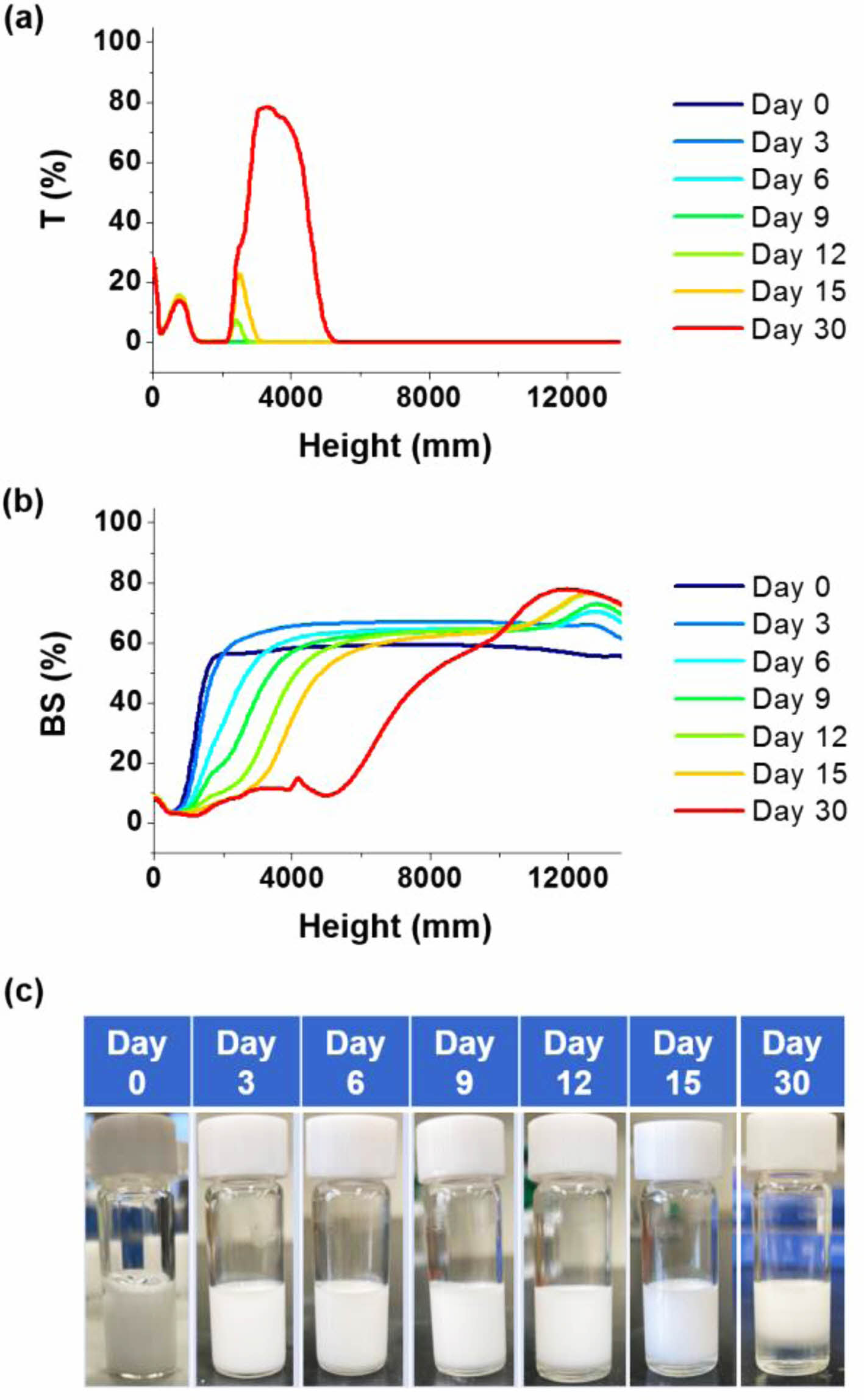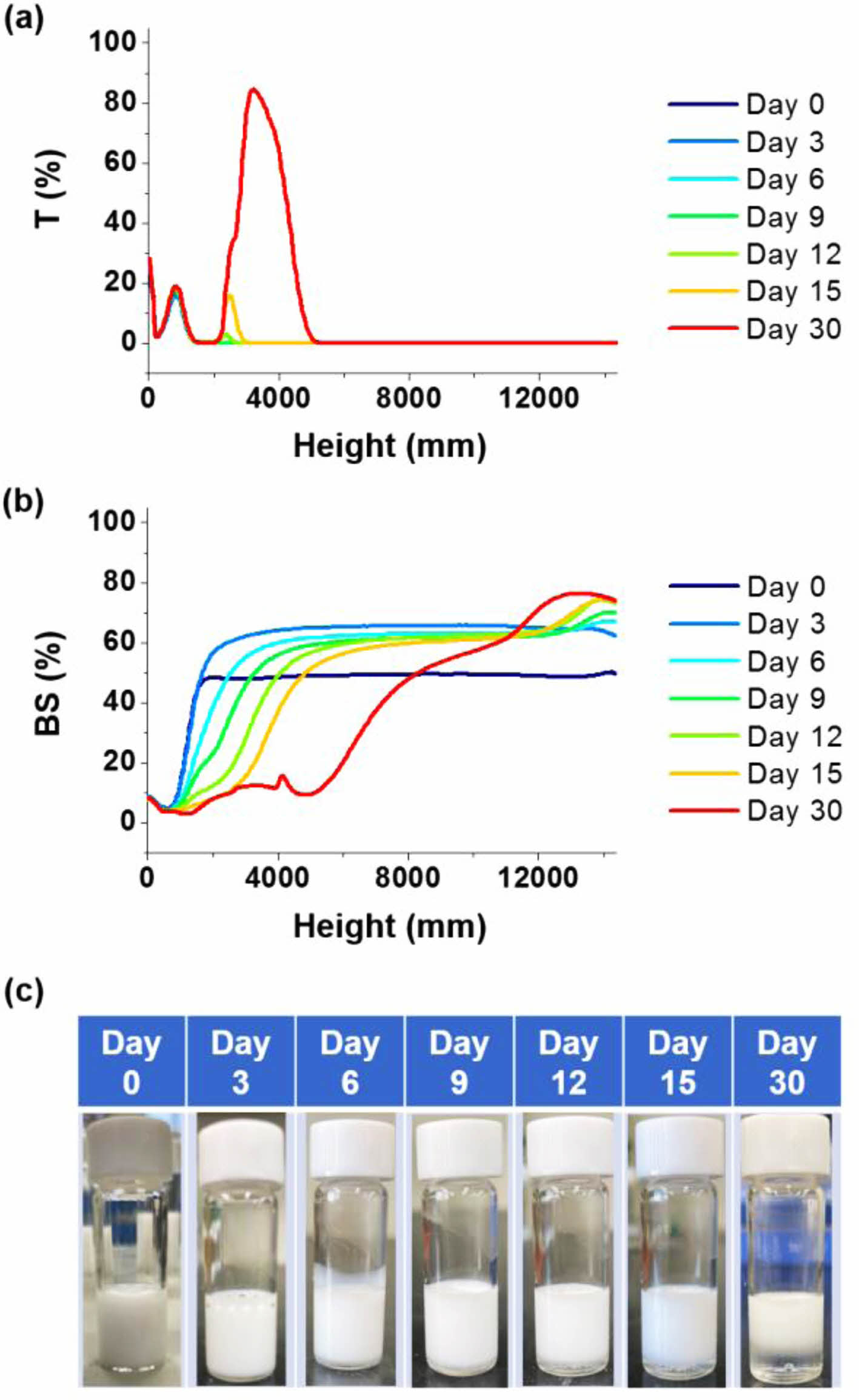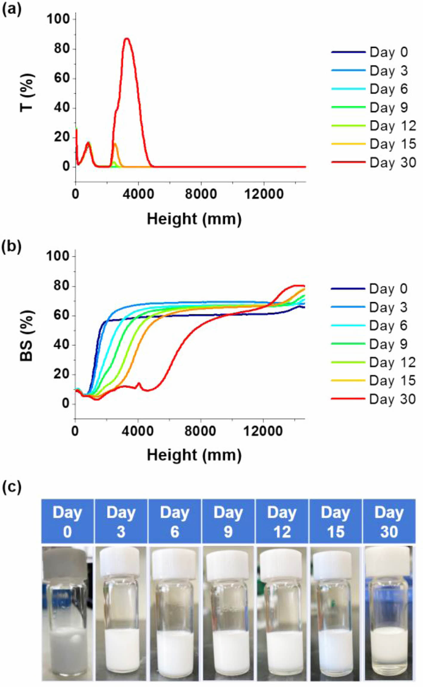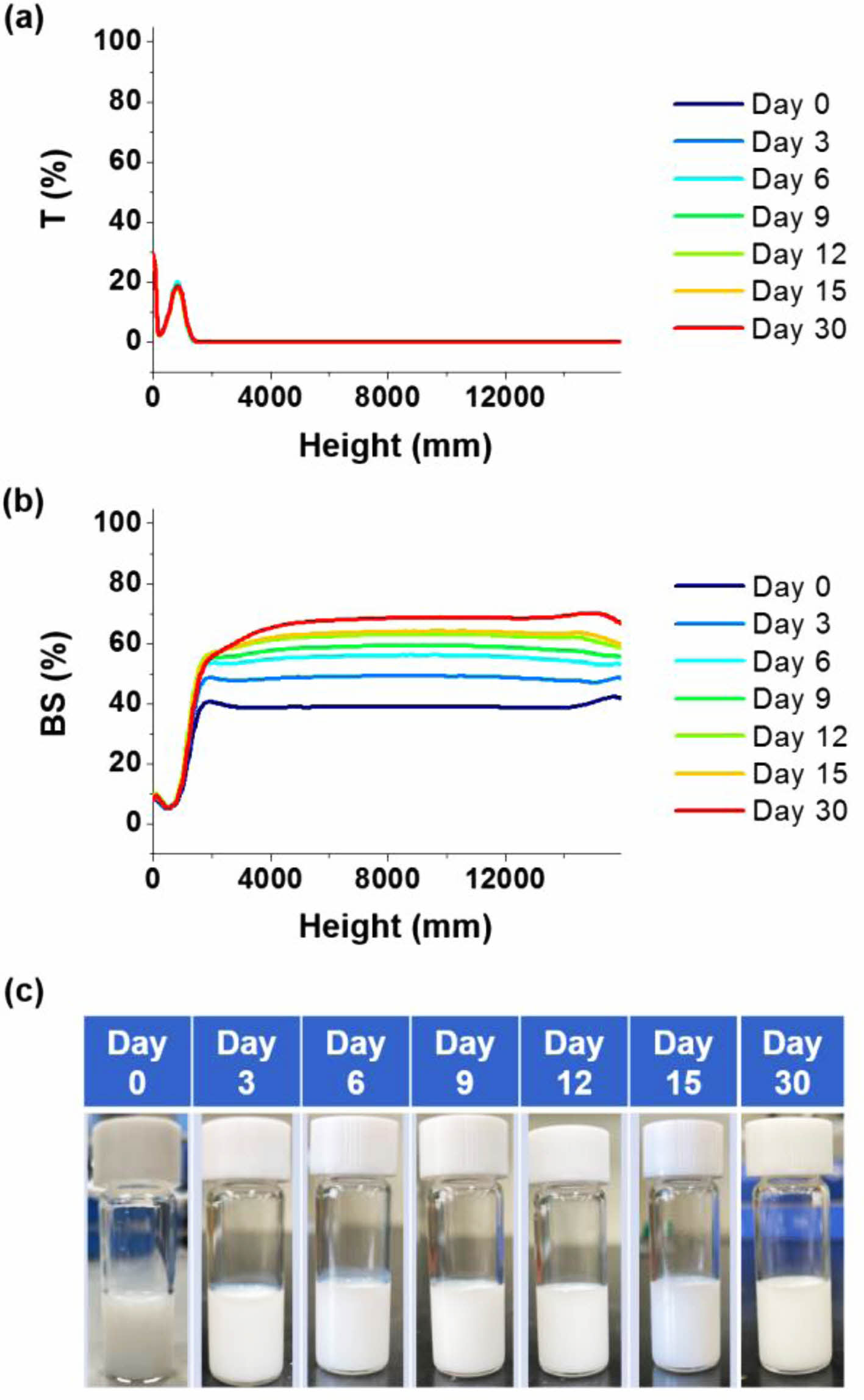 Figure 13 Stability of the emulsion S7: (a) NIR transmittance; (b) backscattering results; (c) visual observation for 30 days. |