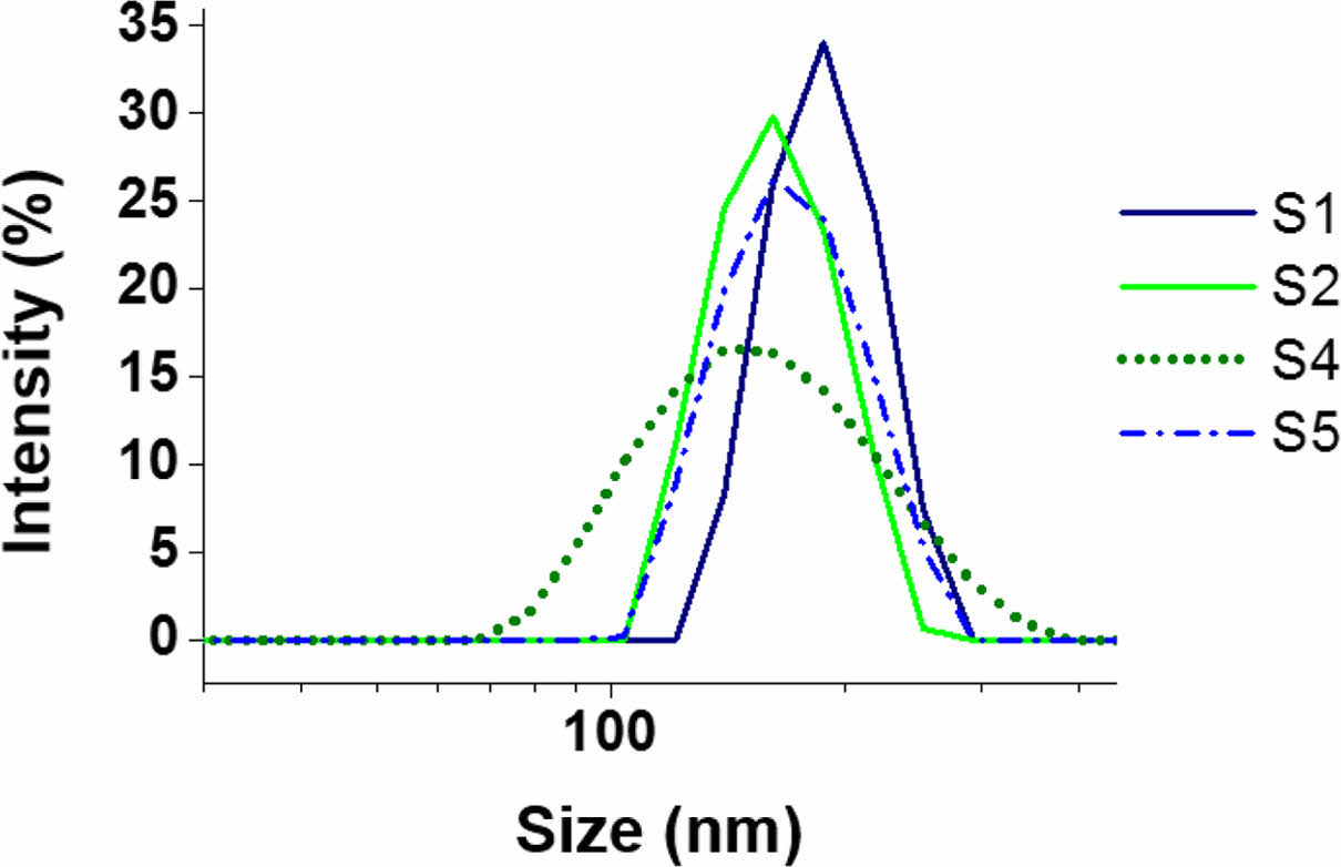 Figure 8 Hydrodynamic diameter distributions of the emulsion droplets dispersed in samples S4 and S5 (those of S1 and S2 were also plotted for comparison). |