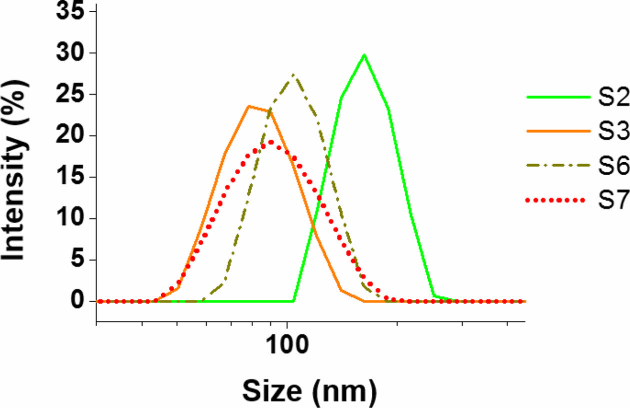Figure 11 Hydrodynamic diameter distributions of the emulsion droplets dispersed in samples S6 and S7 (those of S2 and S3 were also plotted for comparison). |