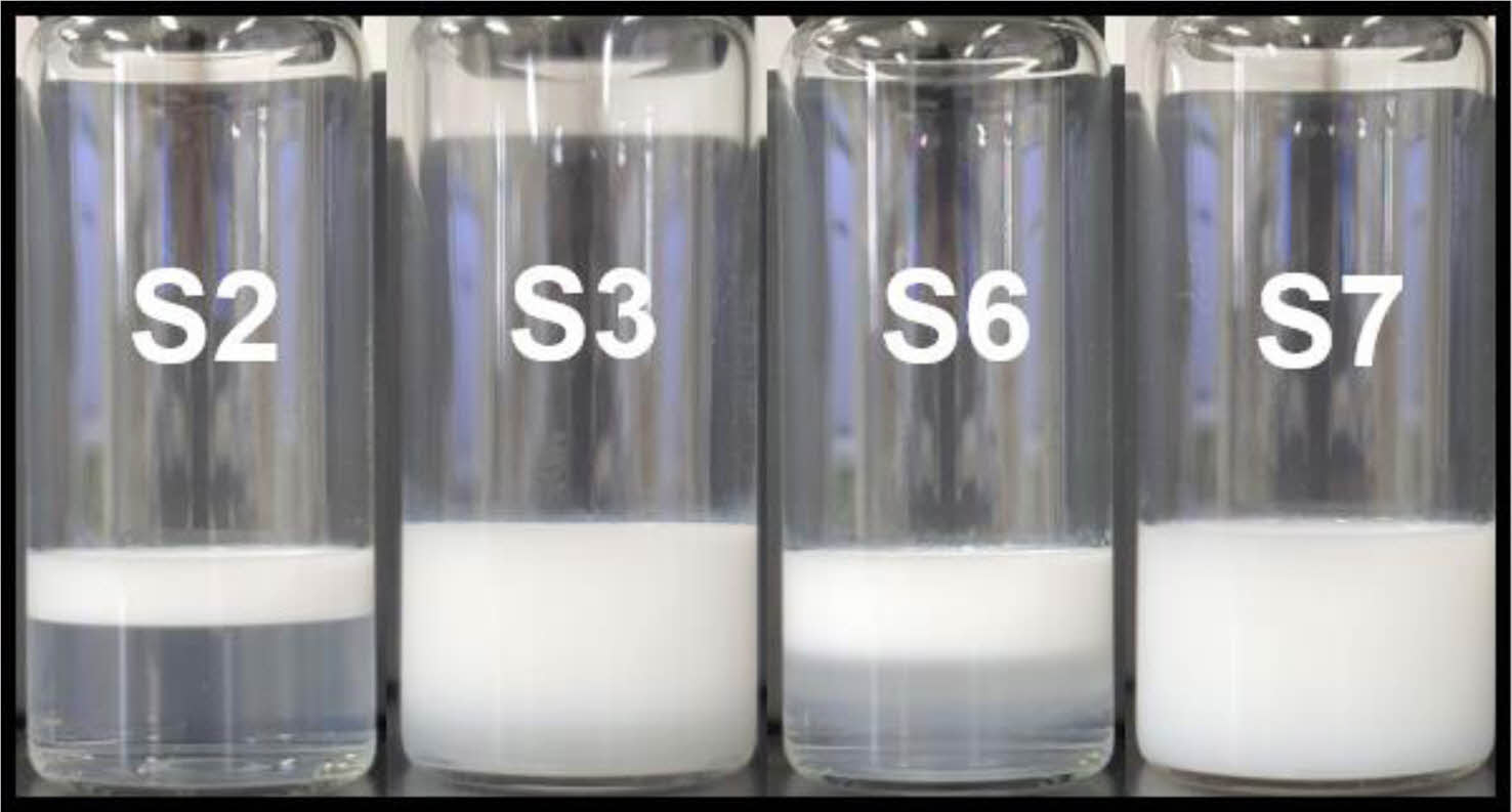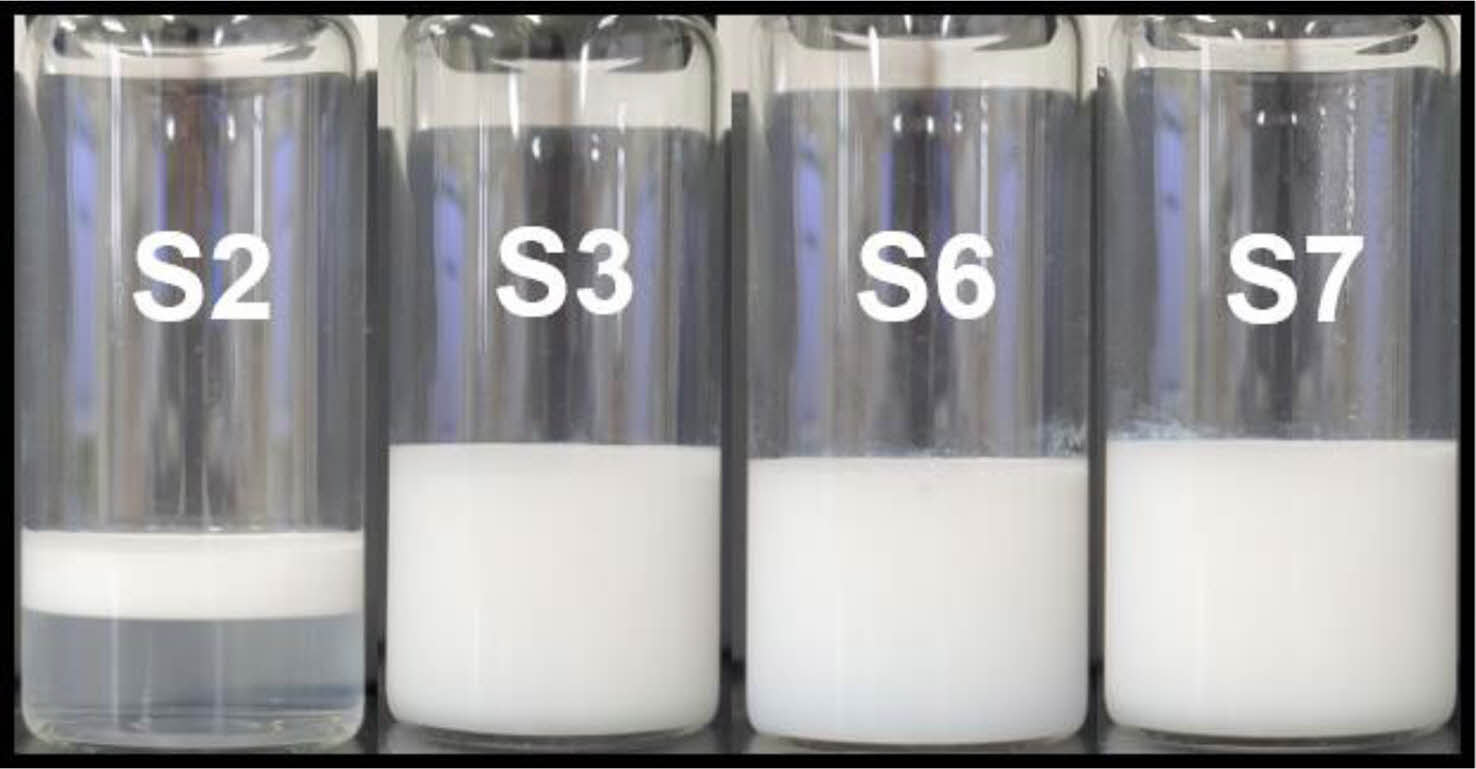 Figure 15은 서로 다른 날 제조된 조성 S2, S3, S6, S7의 독립된 시료들에 대한 관찰 사진을 나타내며, Figure 14의 경우 제조 후 약 3개월, Figure 15의 경우 제조 후 약 9개월 후 사진에 각각 해당한다. Figure 14를 보면, 순수한 C12H26만을 포함한 에멀젼 S2의 경우 3개월 이내 크리밍 현상이 큰 폭으로 진행되었음을 알 수 있는 반면, C12H26보다 탄소 수가 많은 C16H34의 에멀젼 S3, C16H34를 분산상 내 20 vol% 포함한 S6, C22H46을 20 vol% 포함한 S7의 경우, 같은 기간 동안 육안으로는 상대적인 안정성 차이가 확인이 안될 정도로 높은 크리밍 안정성을 유지함을 확인할 수 있다. 그러나, Figure 15에 나타낸 것처럼, 약 9개월의 장시간 후 안정성을 보면, S3, S6, S7 사이에 안정성의 상대적 차이가 발생함을 알 수 있고, 이 중에서도 특히 가장 높은 탄소의 C22H46을 포함한 S7의 경우, 육안으로는 크리밍 현상을 식별할 수 없을 정도로 높은 안정성을 유지함을 확인할 수 있었으며, 이러한 결과는 30일 간 Turbiscan을 이용하여 관찰한 T 및 BS의 변화를 통해 예측할 수 있었던 경향과 일치할 뿐만 아니라, 관찰된 현상의 높은 재현성을 확인시켜 주었다.