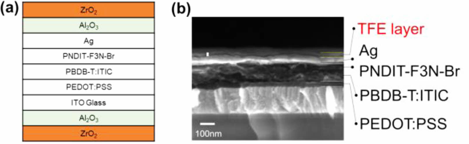 Figure 1 (a) OPV device architecture with TFE encapsulation layer; (b) Cross-sectional SEM image of OPV device with TFE layer. |