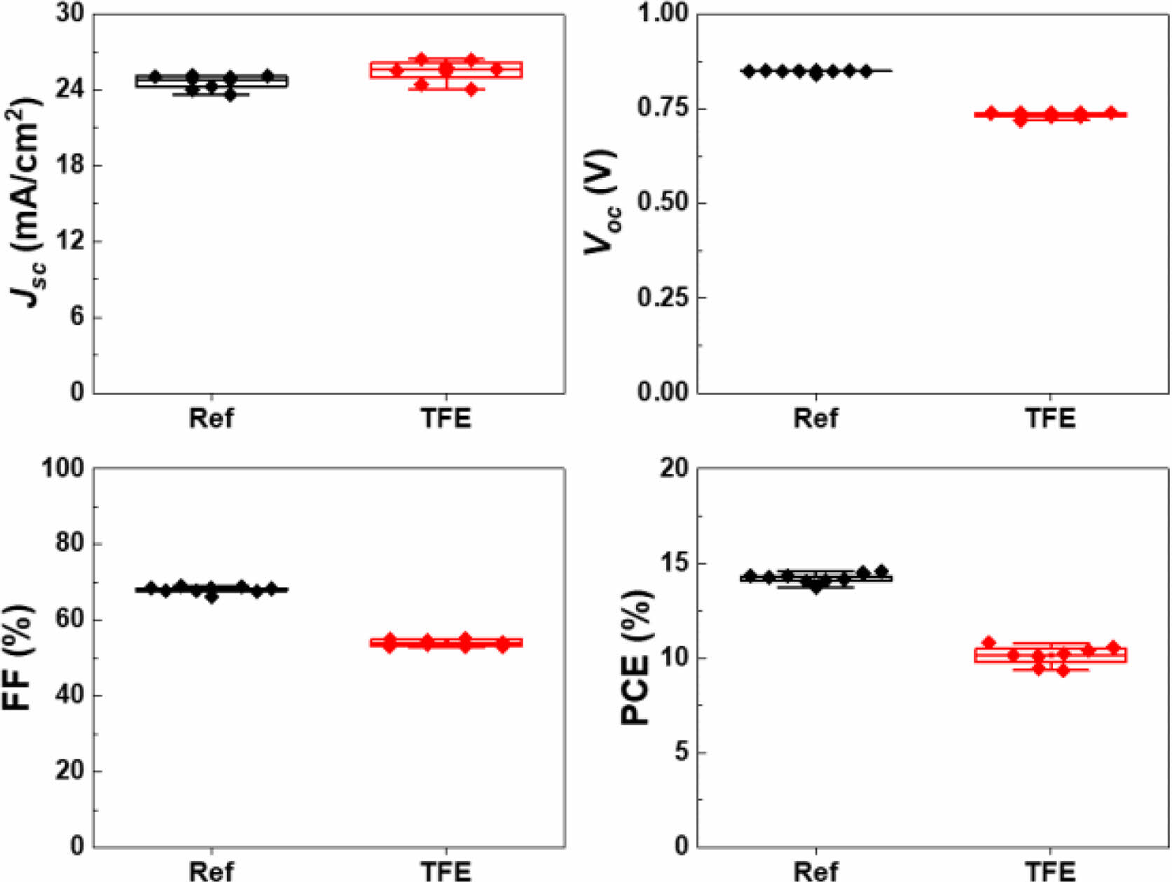 Figure 2 Statistical photovoltaic parameters of OPV devices with and without TFE. |