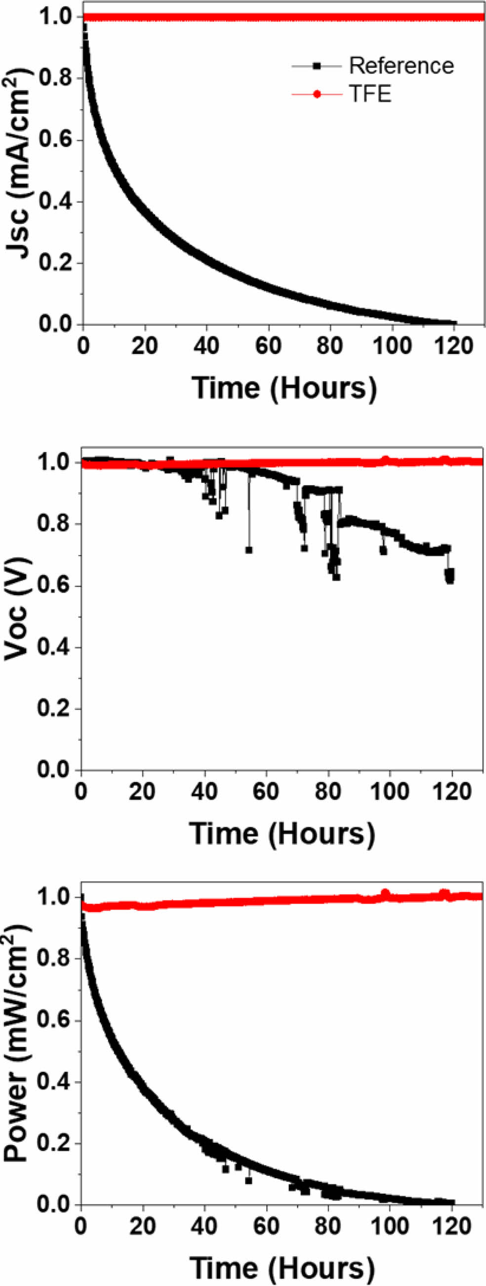 장기 안정성. TFE이 제작된 유기 태양전지 장기 안정성에 기여하는지를 판단하기 위해 LED 1 sun 조건에서 MPPT 테스트를 진행하였다. 소자는 TFE 외에 추가적인 봉지 처리는 하지 않았다. TFE의 효과를 비교하기 위해 TFE 처리를 하지 않은 소자도 함께 측정하였다. 소자는 추가적인 환경 조건 조절 없이 상온 조건에서 LED 광원에 노출되었으며 LED 광원에 의해 소자의 측정 주위 포화 온도는 50-60 oC 사이로 측정되었다. MPPT 측정 결과 Figure 3과 같은 결과를 얻었다. 수분과 산소에 취약한 유기태양전지는 광에 노출 시 저하가 더 빠르게 진행되어 120시간이 되었을 때 완전 구동이 멈췄다. 반면, TFE를 처리한 소자의 경우 ALD TFE 코팅 공정에 의해 초기 열에 의한 손실은 있었으나 수분과 산소 차단에 의해 120시간이 지나도 초기 성능을 100% 유지하며 성능이 저하되지 않는 것을 확인할 수 있었다. 이 결과를 통해서, 유기태양전지의 성능 저하는 열보다는 수분과 산소에 의해 영향을 더 받는다는 것을 알 수 있었다. 흥미로운 사실은 TFE를 처리한 소자에서 오히려 약간의 성능 향상을 보인다는 것이다. 특히 ALD TFE 처리 중에 떨어진 Voc가 구동 중에 회복하는 것으로 보인다.