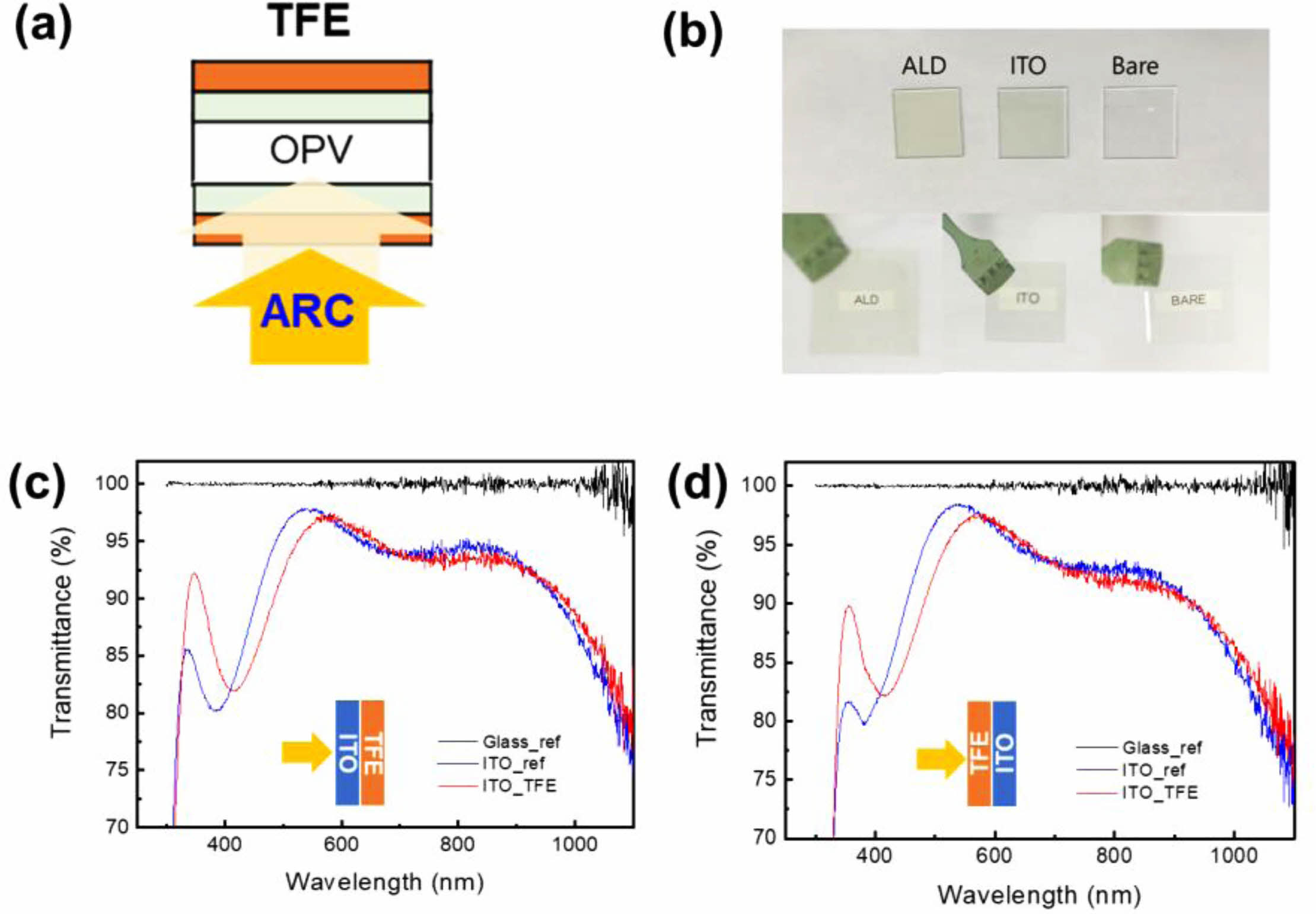 Figure 4 (a) Structure of OPV device with dual side TFE; (b) Pictures of ALD TFE treated ITO (left), reference ITO (middle) and bare sodalime glass (right); (c) Transmittance of ITO with TFE measured from ITO side; (d) Transmittance of ITO with TFE measured from TFE layer side. |