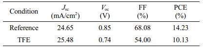 TFE 처리를 하기 전 소자 제작 직후 솔라 시뮬레이터를 이용하여 측정한 결과는 Table 1과 Figure 2와 같다. 본 연구에서 제작된 소자 또한 특히 개방전압(open-circuit voltage, Voc)과 충진율(fill factor, FF)에서 TFE 처리 전에 비해 다소 손실을 보인다. 이는 80 oC 이하 온도에서 유리전이 온도를 갖는 PEDOT:PSS가 장시간 열에 노출되어 물성이 변하면서 소자 성능 저하에 영향을 준 것으로 판단된다.14