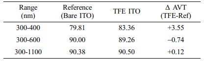파장 영역별로 계산된 AVT 값을 보면 대부분의 유기태양전지 전자주개 고분자 물질과 페로브스카이트의 흡광 파장 영역인 300-400 nm 영역에서 기존 ITO 기판 대비 투과도가 3.55% 향상된 것을 확인할 수 있다. 이와 유사한 원리로 400-700 nm 영역의 흡광 파장을 갖는 전자주개의 고분자 물질인 PBDB-T을 사용했을 때, TFE 직후 열에 의해 소자 성능 중 Voc와 FF는 저하되었지만 Ag 전면 전극 쪽에서 들어오는 빛의 양의 증가로 Jsc가 비교적 향상된 것으로 보인다. 전체 300-1100 nm 영역을 기준으로 계산했을 때도 430-600 nm 영역의 손실을 고려하더라도 전체적으로 0.12%가 향상된 값을 보인다. 이 결과는 향후 300-400 nm 영역에서 강한 흡광 특성을 보이는 광활성 물질을 이용하여 태양전지 소자를 만들 때 장기 안정성 확보를 위한 TFE를 전면과 후면, 양쪽 모두에 코팅하여 수분과 산소의 침투를 방지할 뿐만 아니라 ARC 효과로 광활성층까지 도달하는 입사량 또한 증가시켜 태양전지의 효율을 향상시키는데 응용할 수 있다. ARC 효과를 향상시키기 위해서는 TFE의 소재와 층 수, 두께를 달리하여 굴절률과 ARC 효과를 조절하는 추가적인 연구가 필요하다.