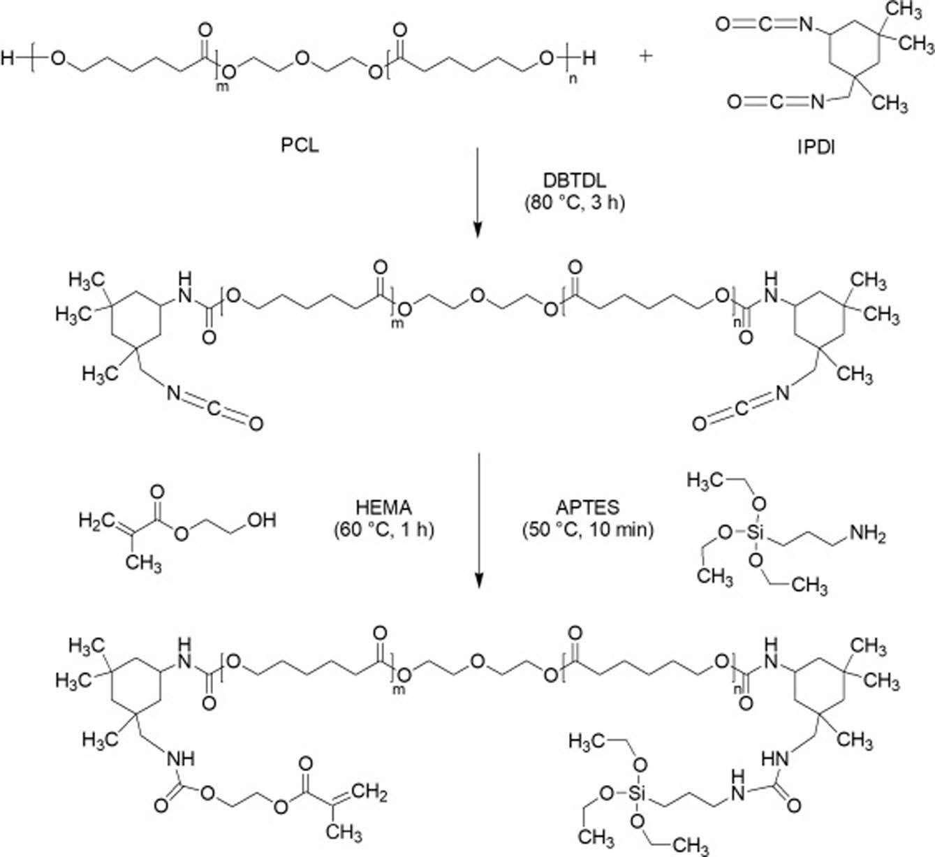 PUAS olg. 의 구조적 특성. Figure 2에 PUAS olg. 합성 과정 중 각 반응 단계에서의 화학적 구조를 나타내었다. 3500 cm-1에서의 피크는 PCL의 -OH stretching에 의한 것이고, IPDI 투입 후 2270 cm-1에서 -NCO stretching에 의한 피크가 나타난다.16 DBTDL에 의해 -OH기와 -NCO기 간 우레탄 반응이 촉진되면서 -NCO stretching 피크는 감소하고, 3340 cm-1 에서의 N-H stretching과 1520 cm-1에서 C-N stretching에 의한 피크가 생성된다.17 HEMA 투입 후 1620 cm-1에서 C=C stretching이 생성되며, APTES 투입 후 1100 cm-1에서 Si-O-R stretching이 생성되고 우레아 결합에 의하여 NH 피크가 증가한다. 최종적으로 -NCO기가 모두 소멸한 것을 확인할 수 있었다. 또한, 고분자 주사슬의 C-H stretching은 2900 cm-1에서 나타났으며, 1750 cm-1 및 1200 cm-1에서의 피크는 각각 C=O stretching 및 C-O-C stretching에 의해 나타났다.18