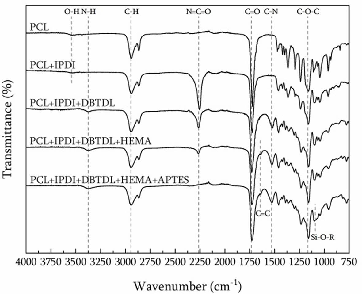 Figure 2 FTIR spectra of prepared PUAS olg.: PCL, PCL+IPDI, PCL+IPDI+DBTDL, PCL+IPDI+DBTDL+HEMA, and PCL+IPDI+ DBTDL+HEMA+APTES. |