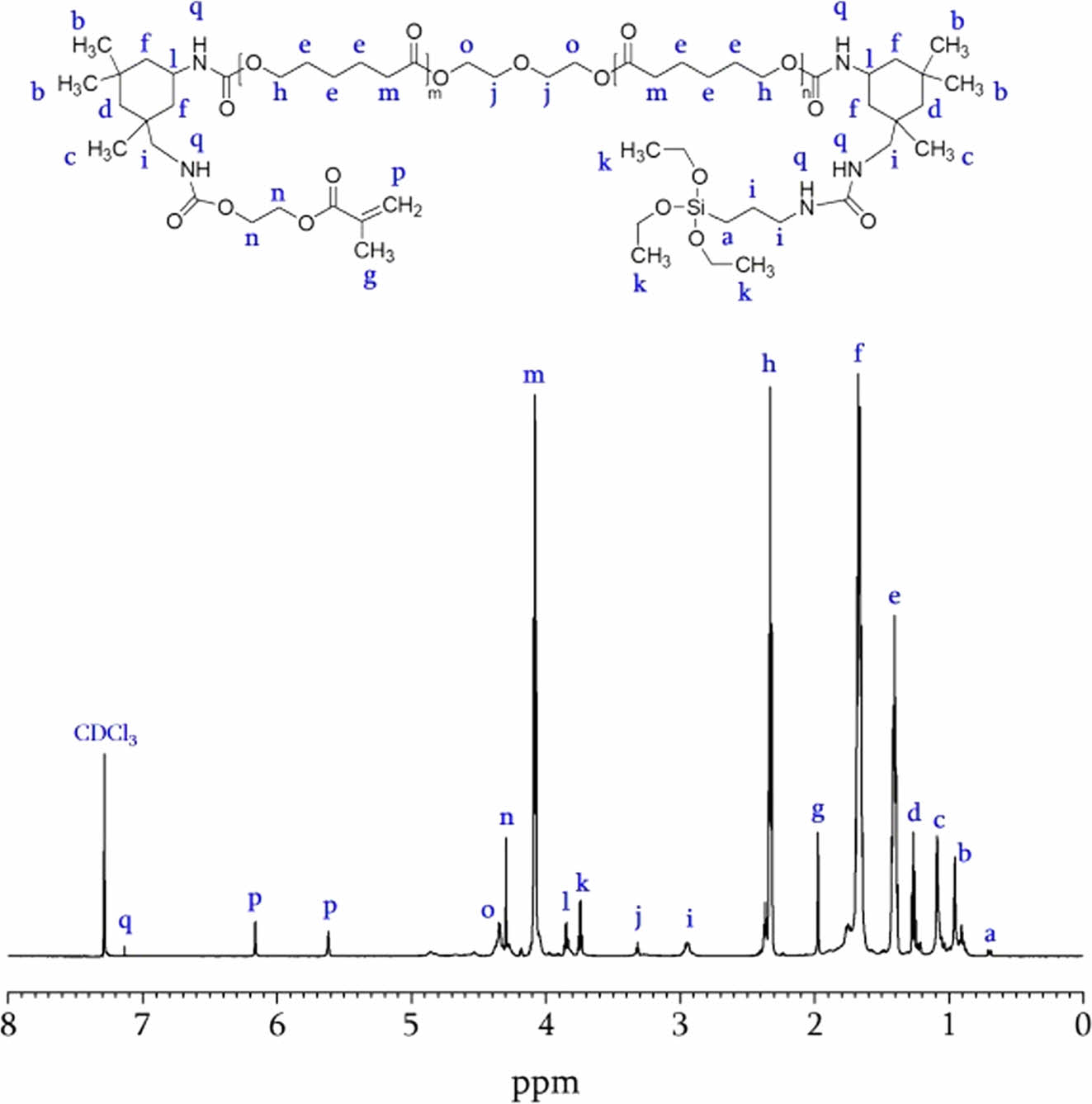 추가적으로 Figure 3에 PUAS olg. 반응 완료 후 1H NMR 스펙트럼을 나타내었다. 합성 검증을 위한 주요 피크는 아크릴기와 실란기로 캡핑된 사슬 말단 부분이다. HEMA의 메틸기(-CH3)는 1.9 ppm에서, 메틸렌기(=CH2)는 5.6 및 6.1 ppm에서 생성된다. APTES의 Si에 연결된 메틸렌기(-SiCH2-)는 0.7 ppm에서, 메톡시기(-Si(OCH3)3는 3.7 ppm에서 생성된다.19,20 이로써 사슬 말단이 HEMA 및 APTES로 캡핑된 PUAS olg.가 성공적으로 합성되었음을 확인하였다.