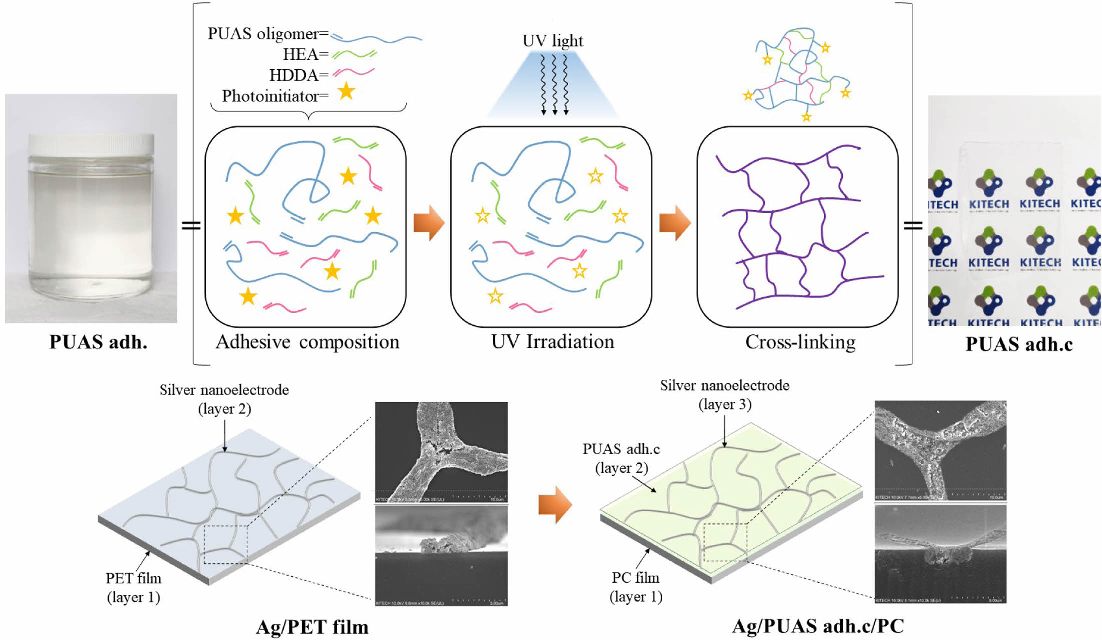 The silane-capped polyurethane acrylate (PUAS) based adhesives were obtained using the PUAS oligomer, acrylic diluents and photoinitiator. The Ag nanoelectrodes on the polyethylene terephthalate film are transferred to the polycarbonate (PC) film to form Ag/PUAS adh.c/PC by curing the transparent liquid PUAS adh. The optical properties and adhesive properties are controlled by the optimal content of photoinitiator and diluent.