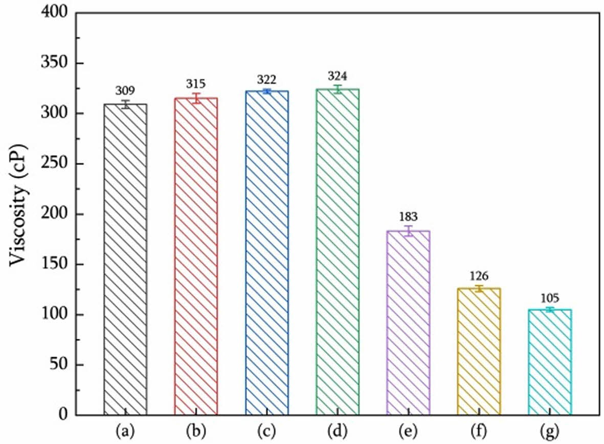 Figure 6 Viscosity changes of PUAS samples with different initiator and diluent contents: (a) PUAS adh._1_37; (b) PUAS adh._3_37; (c) PUAS adh._5_37; (d) PUAS adh._7_37; (e) PUAS adh._3_30; (f) PUAS adh._3_25; (g) PUAS adh._3_20. |