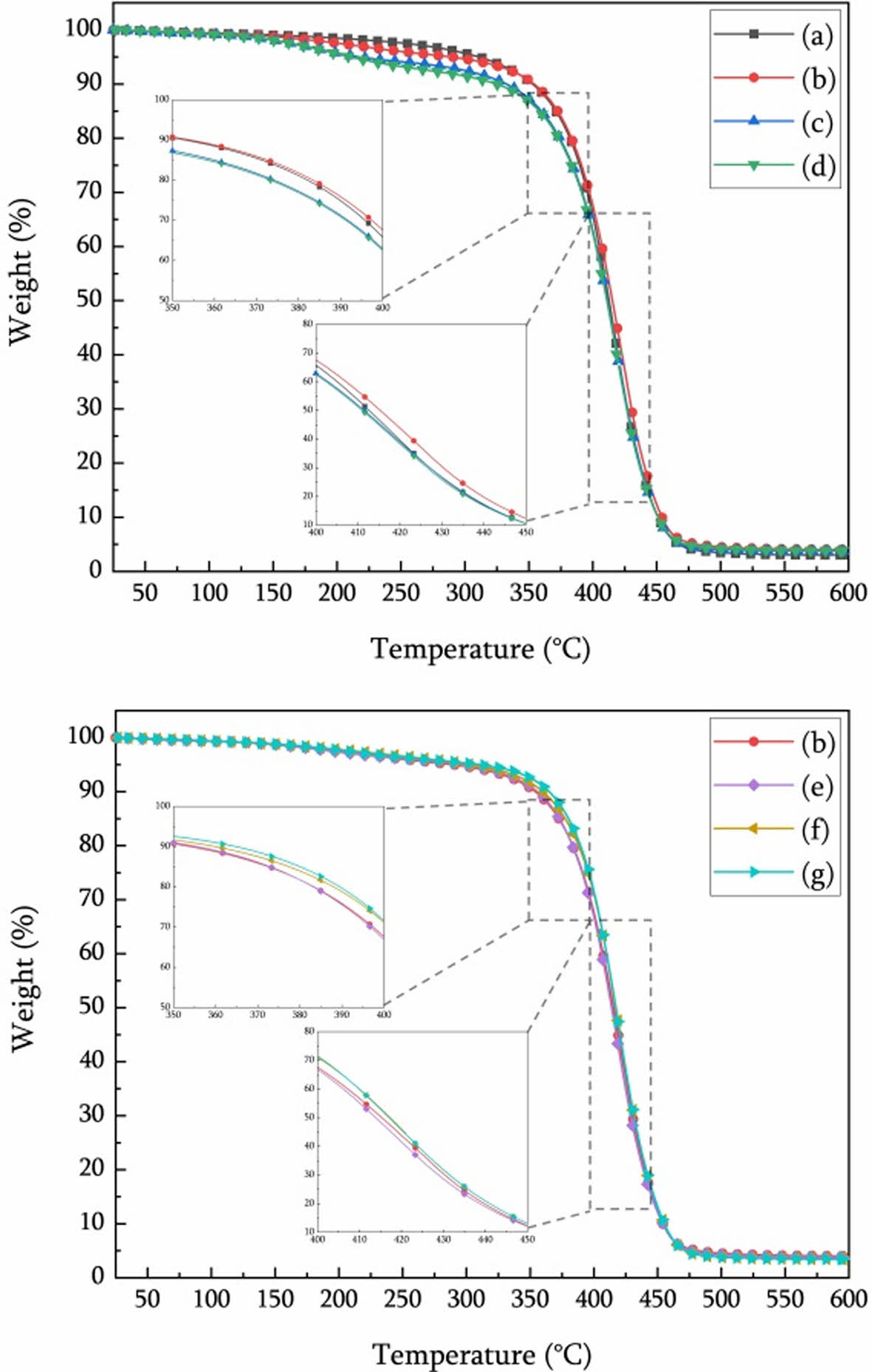 Figure 7 TGA curves for UV-PUAS films with different initiator and diluent contents: (a) PUAS adh.c_1_37; (b) PUAS adh.c_3_37; (c) PUAS adh.c_5_37; (d) PUAS adh.c_7_37; (e) PUAS adh.c_3_30; (f) PUAS adh.c_3_25; (g) PUAS adh.c_3_20. |