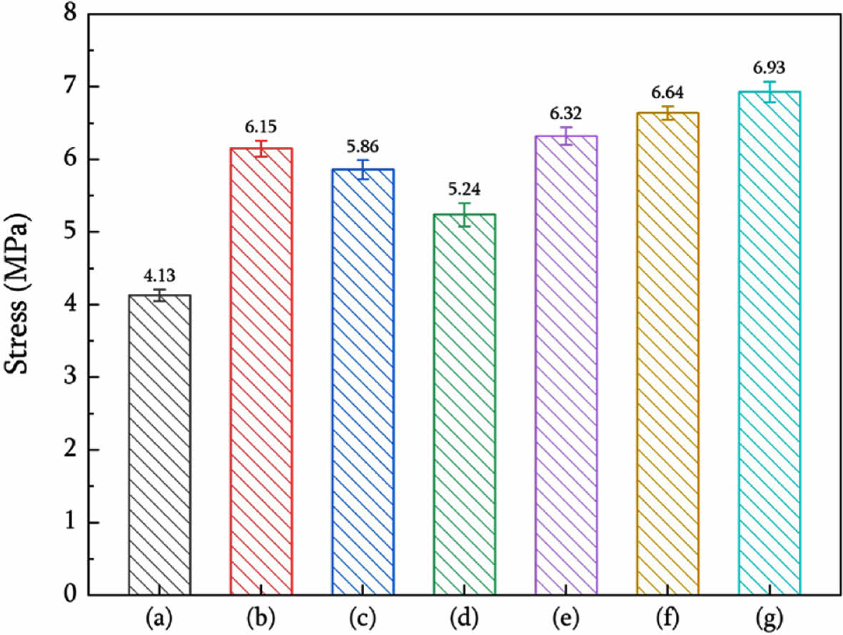 Figure 8 Comparisons of single-lap shear strengths of UV-PUAS films with different initiator and diluent contents: (a) PUAS adh.c_1_37; (b) PUAS adh.c_3_37; (c) PUAS adh.c_5_37; (d) PUAS adh.c_7_37; (e) PUAS adh.c_3_30; (f) PUAS adh.c_3_25; (g) PUAS adh.c_3_20. |