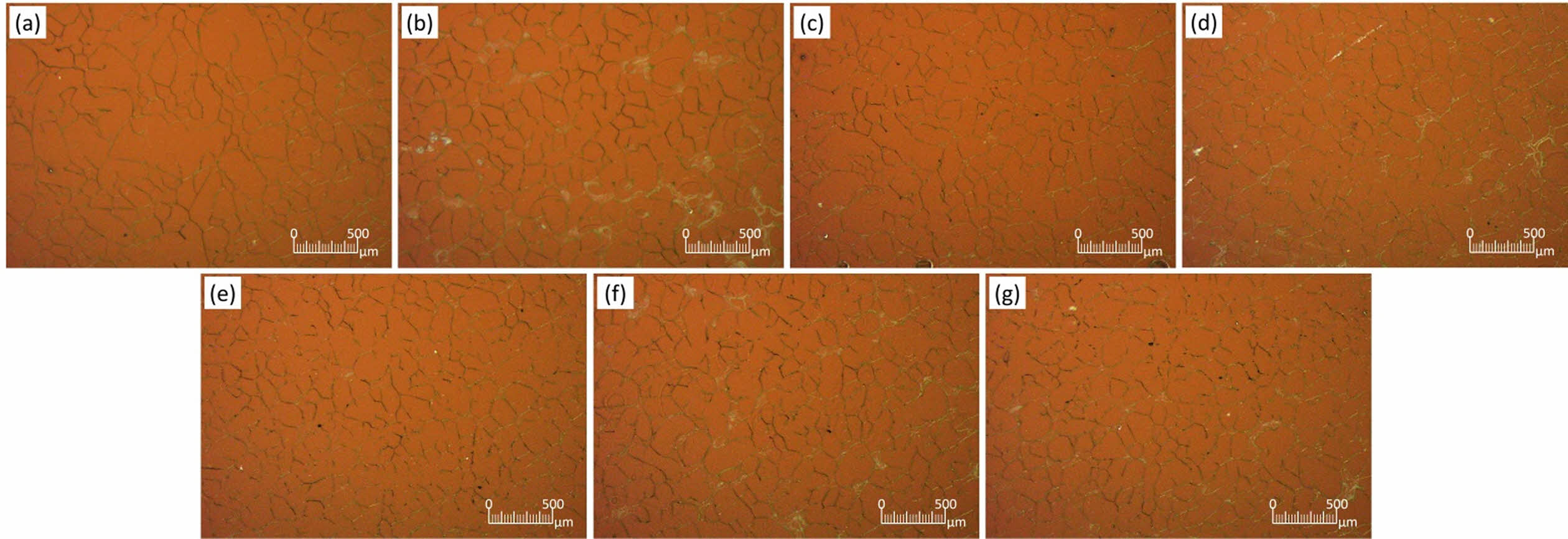Figure 9 Microscopic surface images of PC films after transfer of silver nanoelectrode: (a) Ag/PUAS adh.c_1_37/PC; (b) Ag/PUAS adh.c_3_37/PC; (c) Ag/PUAS adh.c_5_37/PC; (d) Ag/PUAS adh.c_7_37/PC; (e) Ag/PUAS adh.c_3_30/PC; (f) Ag/PUAS adh.c_3_25/PC; (g) Ag/PUAS adh.c_3_20/PC. |