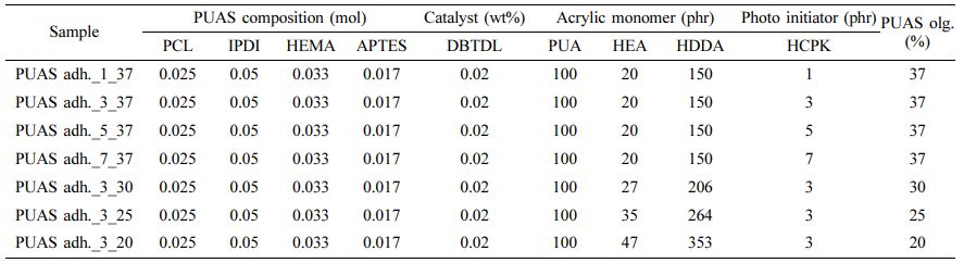 본 연구에서는 HEMA와 (3-aminopropyl) triethoxysilane (APTES)를 도입하여 PUA의 말단을 아크릴기와 실란기로 캡핑하고(이하 PUAS olg.), 은나노 전극 전사용 접착 조성물 내 광개시제를 1, 3, 5, 7 phr 함량별로 첨가하였다. 전사용 접착 조성물의 점도를 낮추고 기능성을 부여하기 위해 아크릴레이트 단량체인 HEA 및 HDDA을 반응성 희석제로 사용하였다. 전사용 접착 조성물 내 PUAS olg.의 양은 유지하고 희석제의 양을 증가시켜 PUAS olg. 함량을 37%, 30%, 25%, 20%로 조절하였다. 광개시제 함량과 반응성 희석제 함량에 따른 접착특성 및 필름특성을 조사하였다.