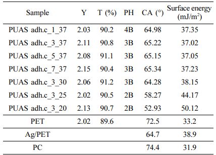 모든 샘플에서의 광학특성은 PUAS olg.와 아크릴 희석제의 고유 특성으로 범용 PET와 유사한 수준으로 우수하게 나타났으며, 최종적으로 Ag/PUAS adh.c_3_20/PC 샘플에서 60 W/sq 이하의 면저항을 나타내며 투명전극 필름에서 요구되는 모든 물성에 부합하는 조건을 확인하였다.