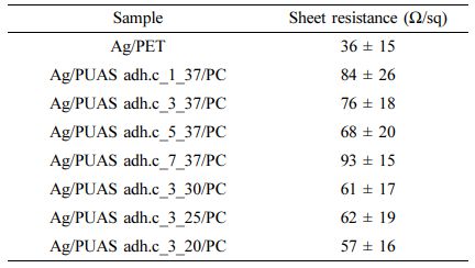 Table 4에 PET에 부착되어있던 Ag가 PC 필름에 전사된 후의 면저항 측정 결과를 나타내었다. Ag가 전사되기 전 Ag/PET에서는 36 W/sq의 저항값을 나타내었다. 모든 샘플에서 면저항 측정이 가능하였으며, 57-93 W/sq 범위의 값을 보였다. Ag/PUAS adh.c_1_37/PC에서 84 W/sq로 가장 높은 면저항 값을 나타내었는데, 이는 Figure 8 결과에 나타난 바와 같이 그물망이 일부 끊어진 부분에 의한 것으로 판단되며, 랜덤한 네트워크 구조에 의해서 전류의 흐름은 유지되는 것을 확인하였다. 접착강도와 전사 상태가 우수한 Ag/PUAS adh.c_3_20/PC 에서는 57 W/sq로 가장 우수한 면저항 값을 확인하였다.