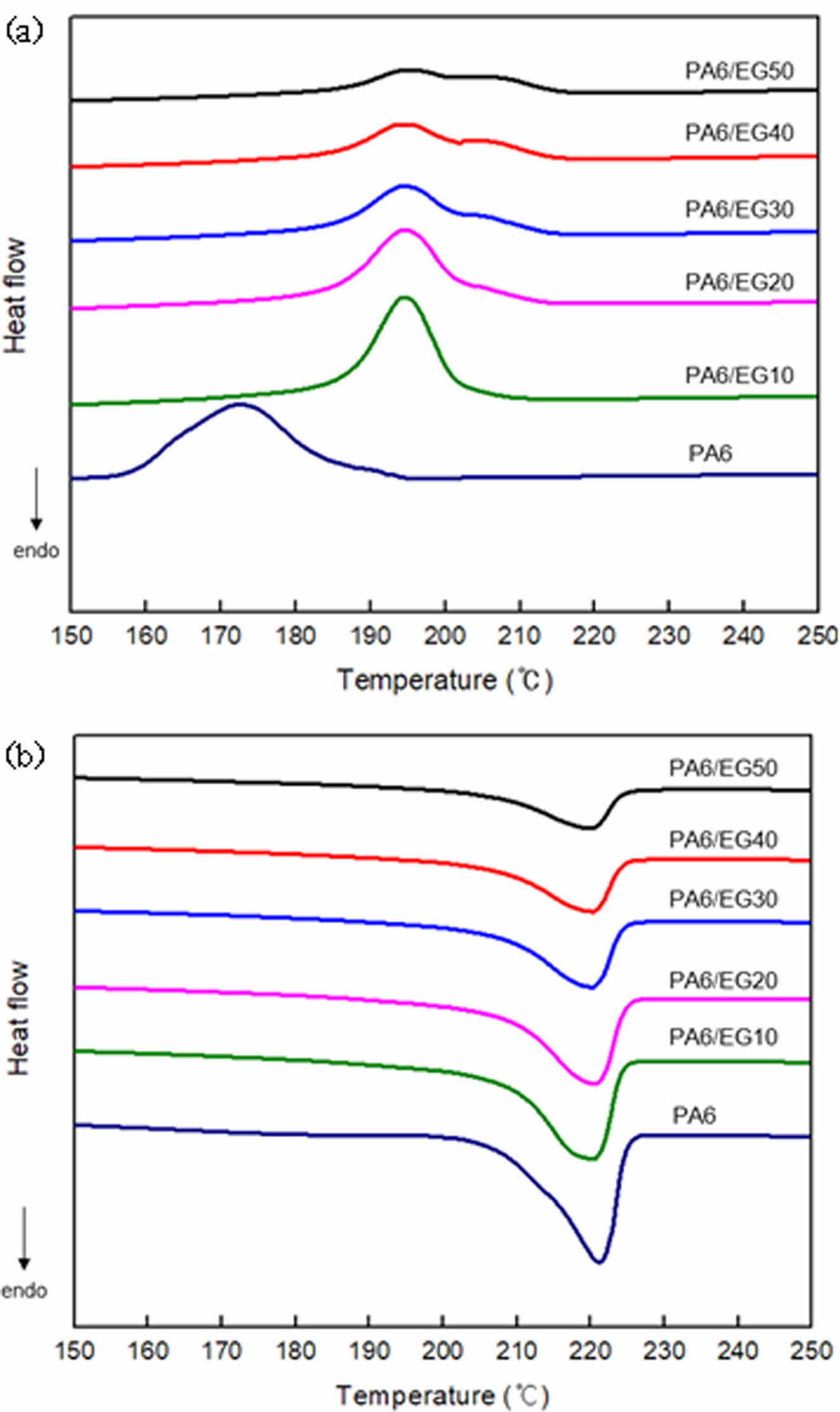 Figure 2 DSC cooling (a) and heating curves (b) of nylon 6/EG composites |