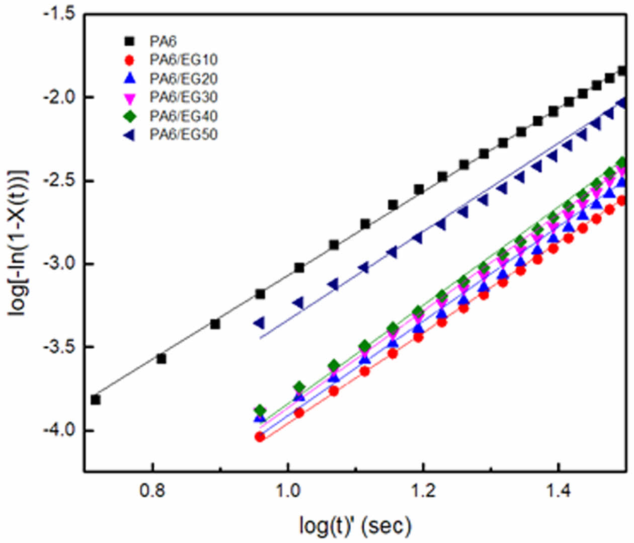 Figure 3 Avrami analysis of nylon 6/EG composites |
